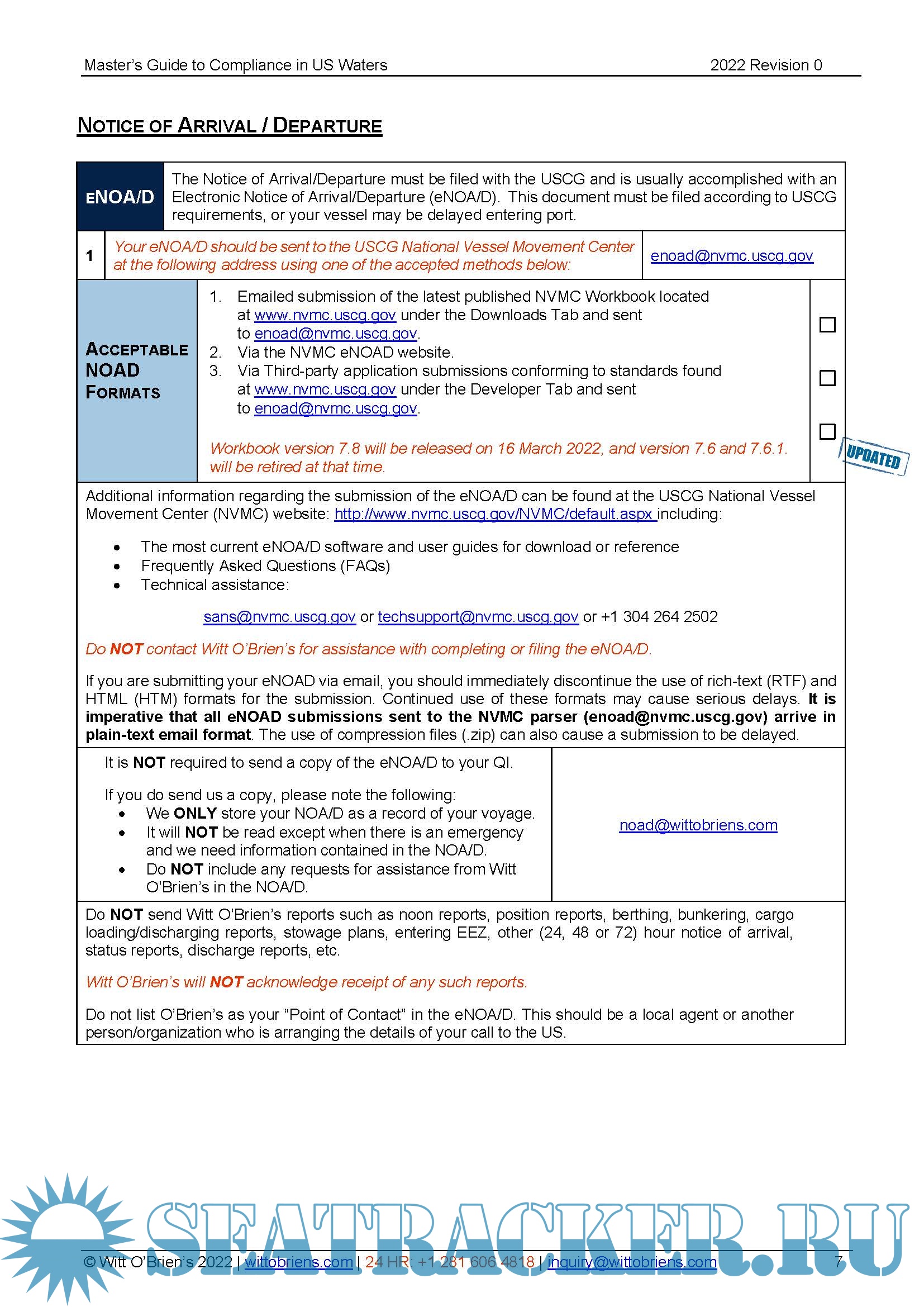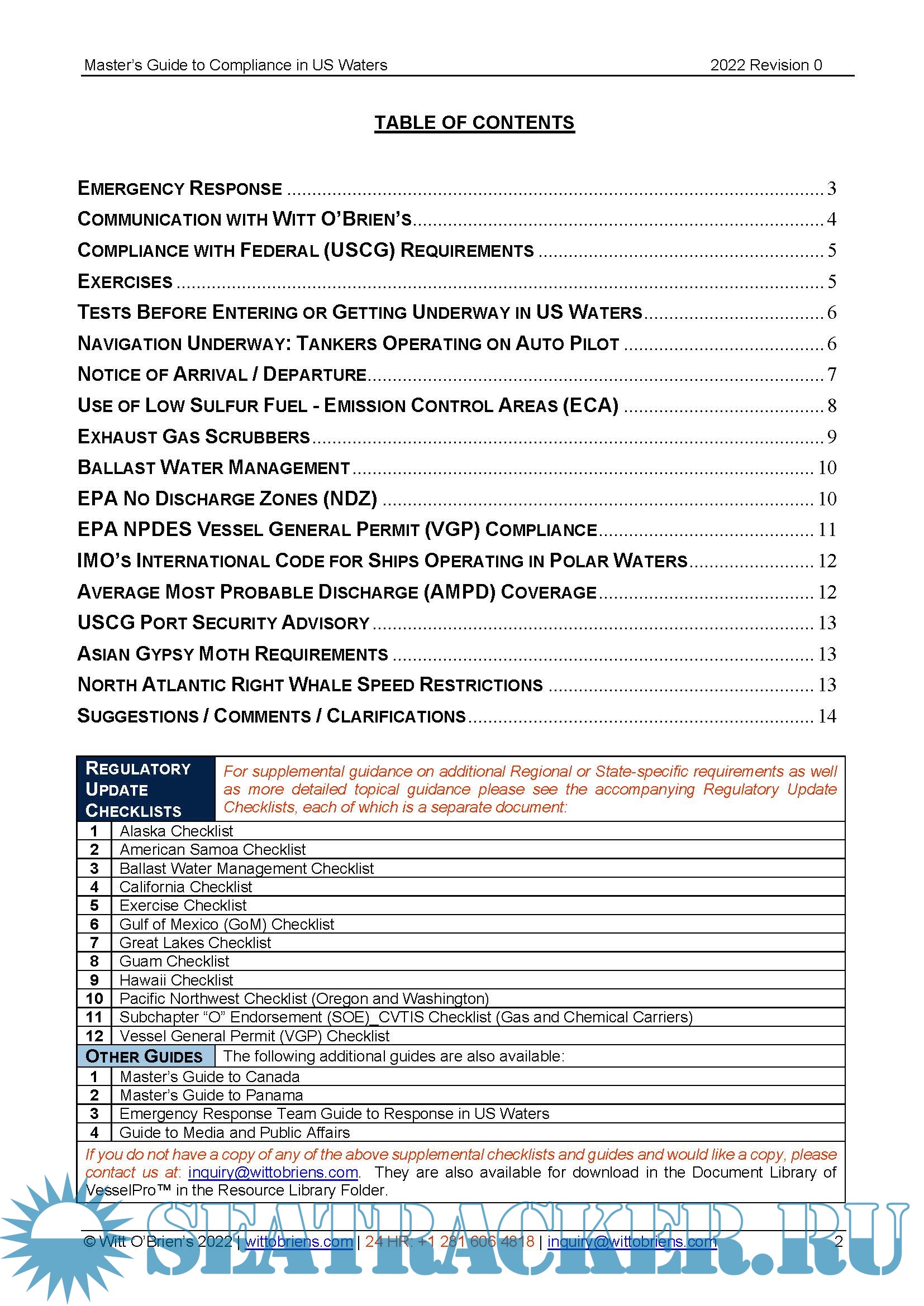 Year: 2022 Language: english Author: Witt O'Brien's Genre: Guide Format: PDF Quality: eBook Pages count: 14 Description: INTRODUCTION: The Master of any vessel making a call to the United States faces several regulatory issues that are specific to the US. Your vessel is enrolled with Witt O’Brien’s to ensure compliance with multiple US, federal, and state regulations. This guide is intended to help the Master effectively and efficiently face these issues. Use of the directions in the guide will allow Witt O’Brien’s to better serve you. Information designed to save you time and effort is present in orange italics.