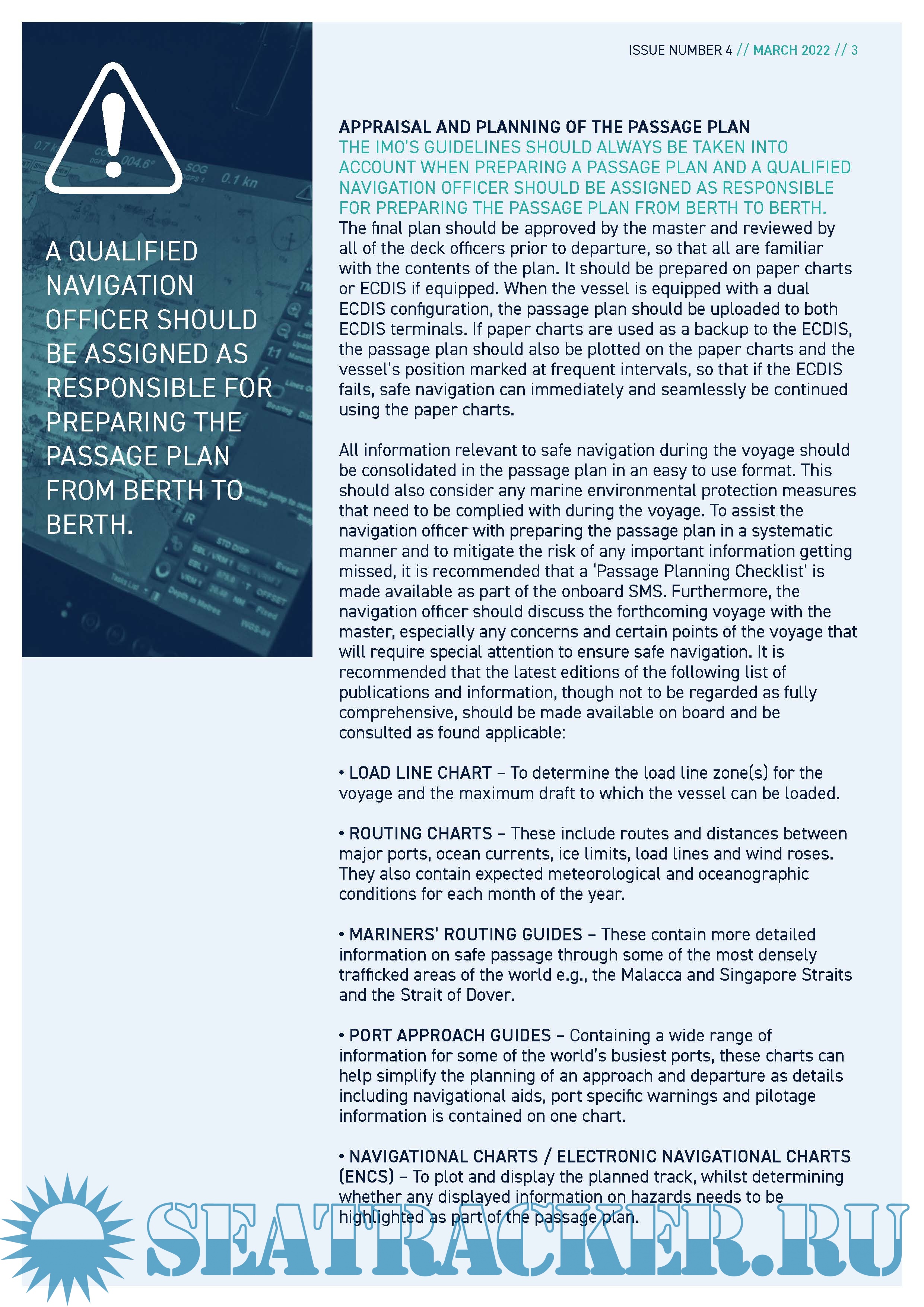 Year: 2022 Language: english Author: Britannia P&I Club Genre: Other Format: PDF Quality: eBook Pages count: 12 Description: Preparing a detailed passage plan can be a substantial task which requires a systematic approach to ensure that all relevant information is assessed and included as applicable. This report provides an overview of some of the important factors and information to be considered when preparing a safe passage plan. There are three essential requirements under the Safety of Life At Sea (SOLAS) Convention that need to be complied with when preparing a passage plan.