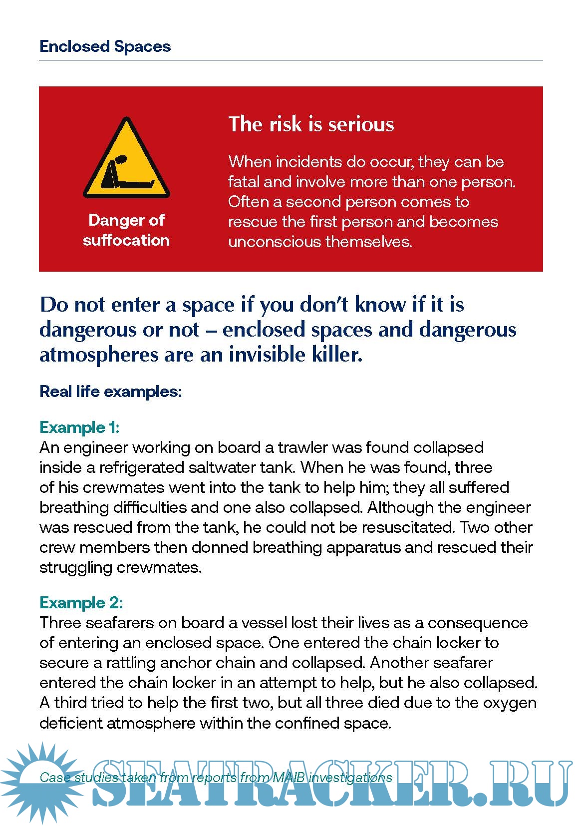 Entry into enclosed spaces onboard ships is sometimes a necessary but dangerous work activity. This guidance outlines regulations and provides information and advice on how to identify an enclosed space and how to reduce the risk to life.