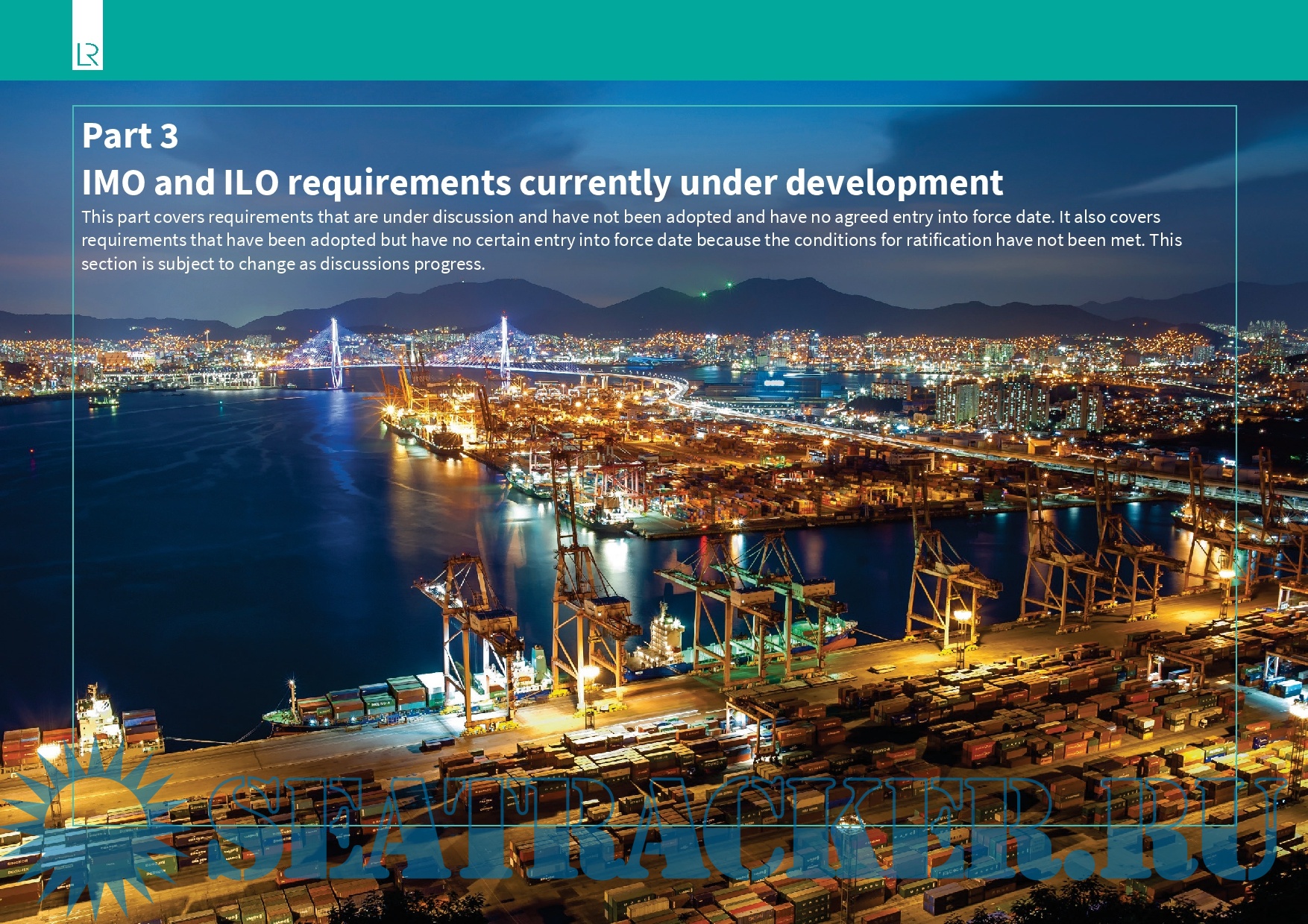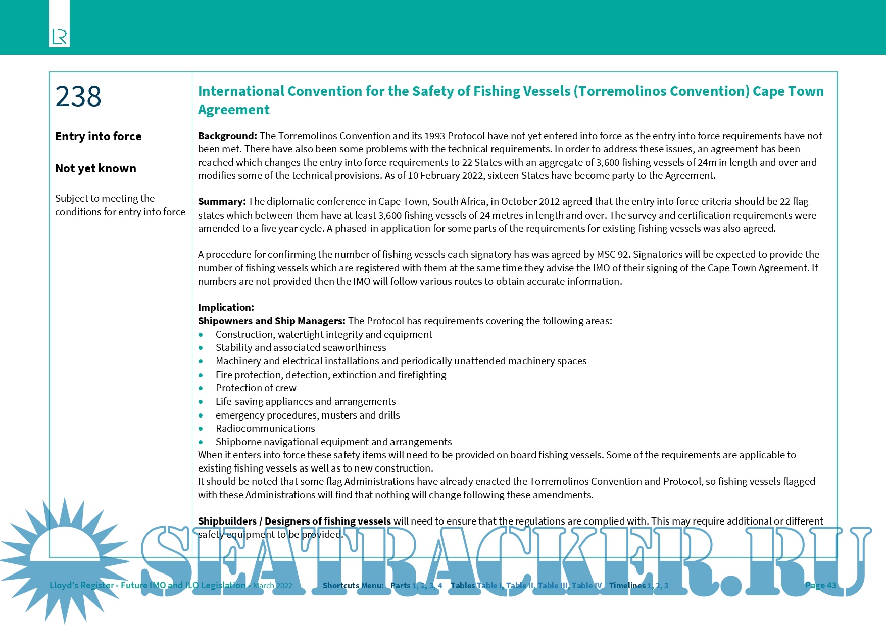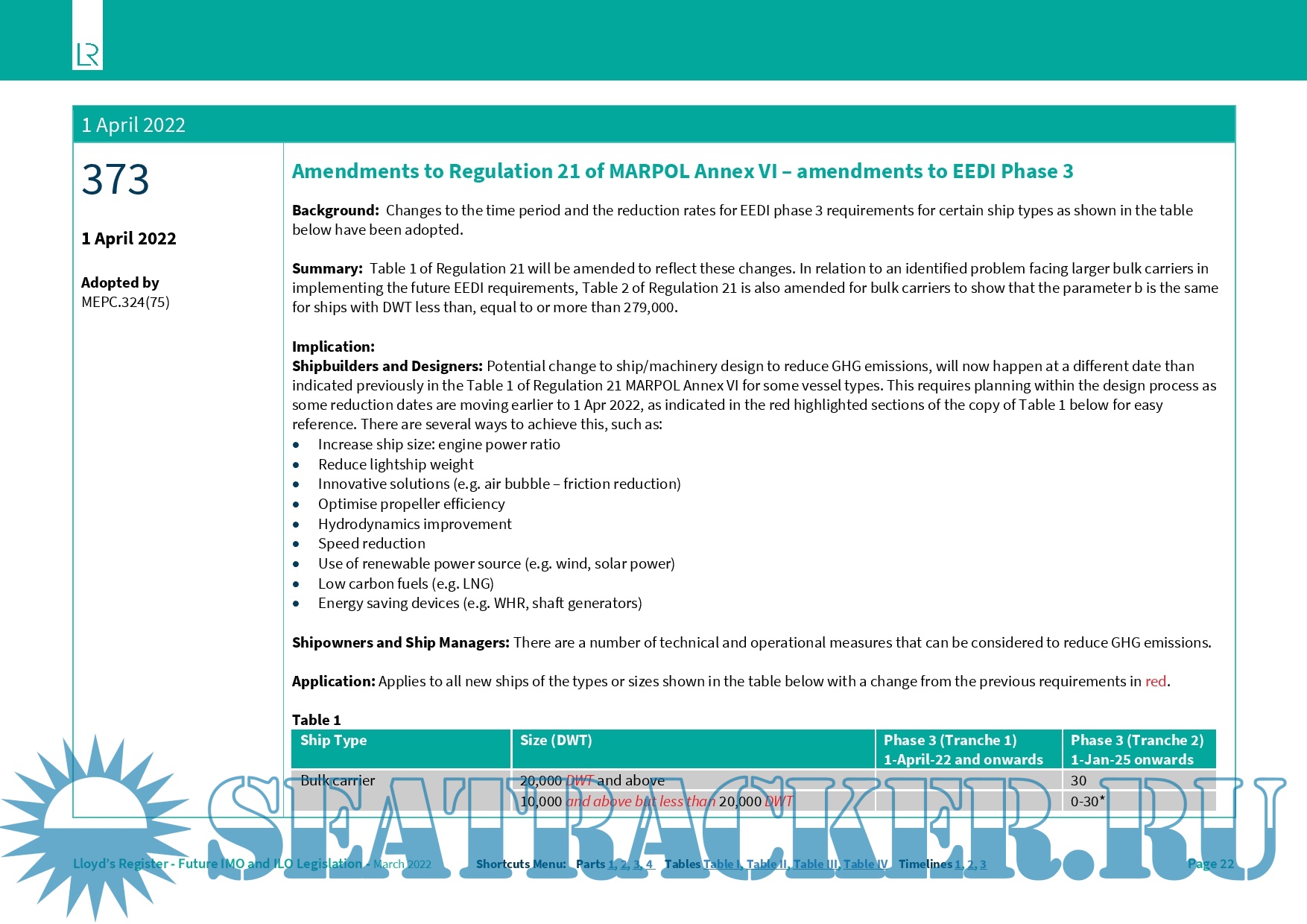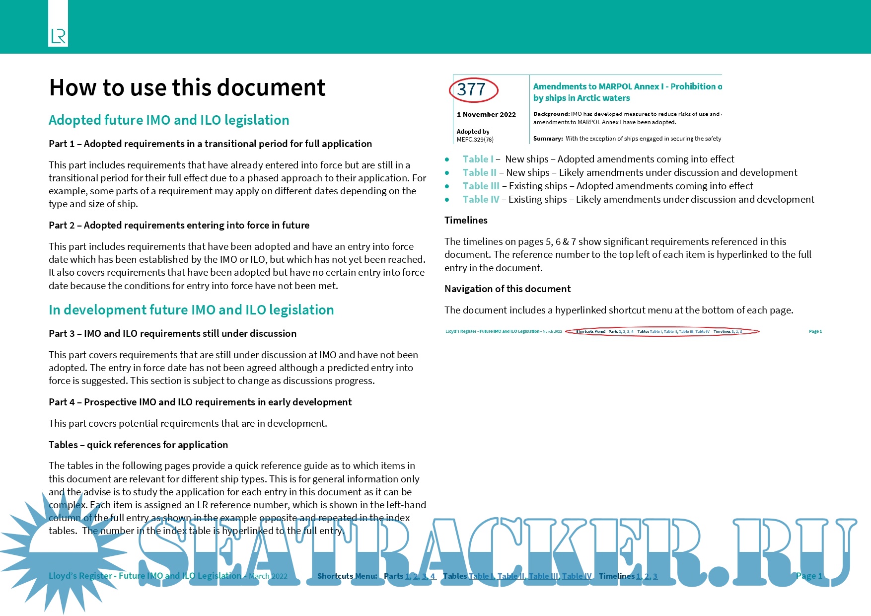 Year: 2022 Language: english Author: LR Genre: Reference book Format: PDF Quality: eBook Pages count: 61 Description: 1. Non-mandatory legislation is not included. 2. Unless otherwise specified, the term ‘cargo ship’ is used to describe any vessel that is not a passenger ship. 3. In the Application section for each entry, references to “all ships” should be taken to mean all ships to which that convention, annex or chapter applies. 4. Applicability of regulations varies for floating storage units (FSU) and floating production storage and offloading units (FPSO) depending on whether they are detached and undergoing voyage, or fixed. The application tables in this report reflect only the minimum requirements which are permanently applicable. Requirements for offshore supply vessels (OSVs) are the same as those listed for general cargo ships. 5. Entries marked with * in the below tables have staggered application dates. Application details should be carefully checked. 6. SOLAS amendments now follow a four-year cycle (next entry into force date is 1 Jan 2024) unless adopted under conditions of exceptional circumstance (see IMO Circular MSC.1/Circ.1481) in which case implementation may be earlier (see note 10). 7. If there is a shipbuilding delay after contract signing, it is important to note that most IMO requirements apply based on the keel laying date and some also have a delivery date requirement, so a delay may necessitate different equipment or design. 8. Some requirements only apply to certain operational choices, such as geographical trading area or activities which may or may not be carried out. In these cases, the widest possible applicability is shown in the tables, and it is necessary to assess whether or not that requirement applies to an individual ship. 9. Occasionally entries are not included in the reference tables, in this edition: - Entries only concerned with one specialised ship type such as unmanned non-self-propelled(UNSP) barges (302) and fishing vessels (238). - Entries for STCW, amendments to STCW Convention (392), amendments to STCW Code (393). 10. Due to the Coronavirus pandemic and the disruption to the IMO programme of meetings causing delay in the progress of some significant items, an additional entry into force date of 1 January 2026 for amendments to SOLAS and associated IMO instruments has been agreed. Subsequent to this, the normal 4 year cycle will recommence with 1 January 2028.