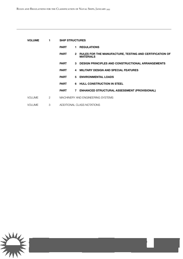 Description: The Rules and Regulations for the Classification of Naval Ships January 2022 includes the following parts: