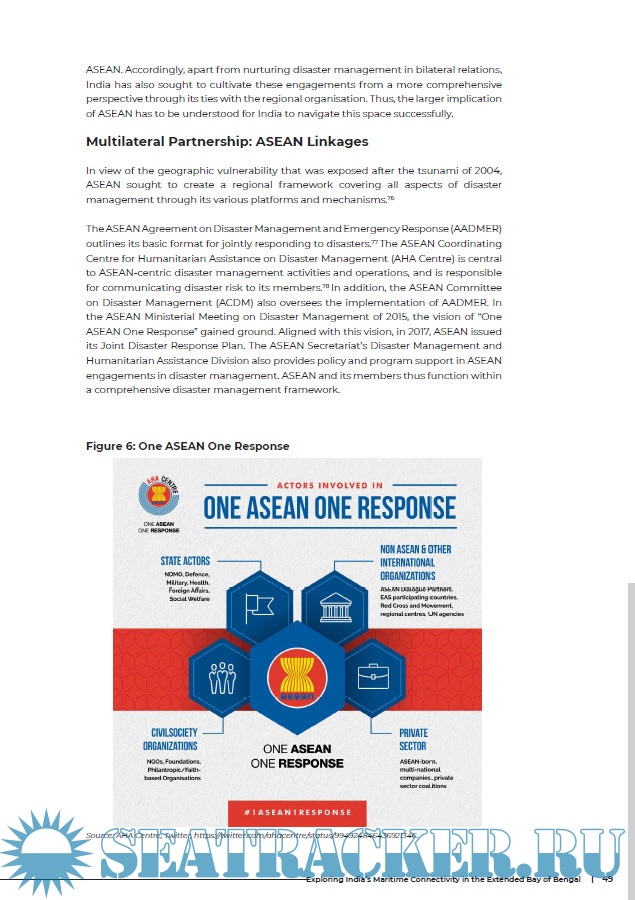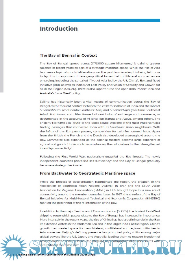 Year: 2019 Language: english Author: Anasua Basu Ray Chaudhury Genre: Research papers Publisher: Observer Research Foundation ISBN: 978-93-89622-15-7 Format: PDF Quality: eBook Pages count: 104 Description: This report makes an appraisal of the geopolitical, geostrategic and geoeconomic dimensions of the linkages between India’s east coast and the ‘extended Bay’—Thailand, Malaysia, Singapore and Indonesia—with respect to port logistics, trade interactions, disaster management and strategic convergences. The aim of this study is three-fold: a) to examine the existing nature of port and commercial linkages between India and the aforesaid littorals and explore how these linkages can be strengthened; b) to examine the vulnerabilities of the littorals in terms of natural calamities and to analyse how and to what extent humanitarian assistance and disaster management can be regionally governed; and c) to explore the Bay of Bengal as a maritime space to understand the geostrategic construct of Indo-Pacific.