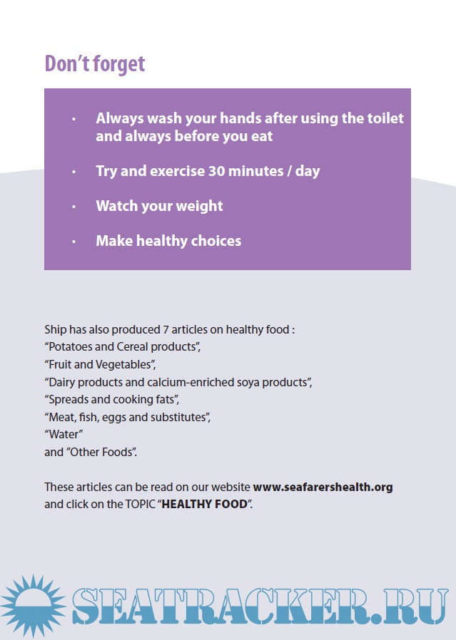 Year: 20xx Language: english Author: ISWAN Genre: Guide Publisher: International Seafarers’ Welfare and Assistance Network (ISWAN) Format: PDF Quality: eBook Pages count: 12 Description: Seafarers can help prevent diseases and improve their overall health by making healthy choices at mealtimes. It is vital that seafarers look after their own health and wellbeing at sea and ashore. Where possible, seafarers should try to make healthy, nutritious food choices and ensure a balanced diet consisting of carbohydrates, protein, fat and fibre, vitamins and minerals with minimum levels of salt, fat and sugar. Proper nutrition, along with adequate rest and sleep, regular exercise and good hygiene help to prevent diseases and improve health overall. This guide encourages seafarers to look after their own health and provides information on proper nutrition relevant to the seafarers' work life. This includes information on essential vitamins, the importance of a healthy breakfast and drinking enough fluids, as well as the types of food to avoid.