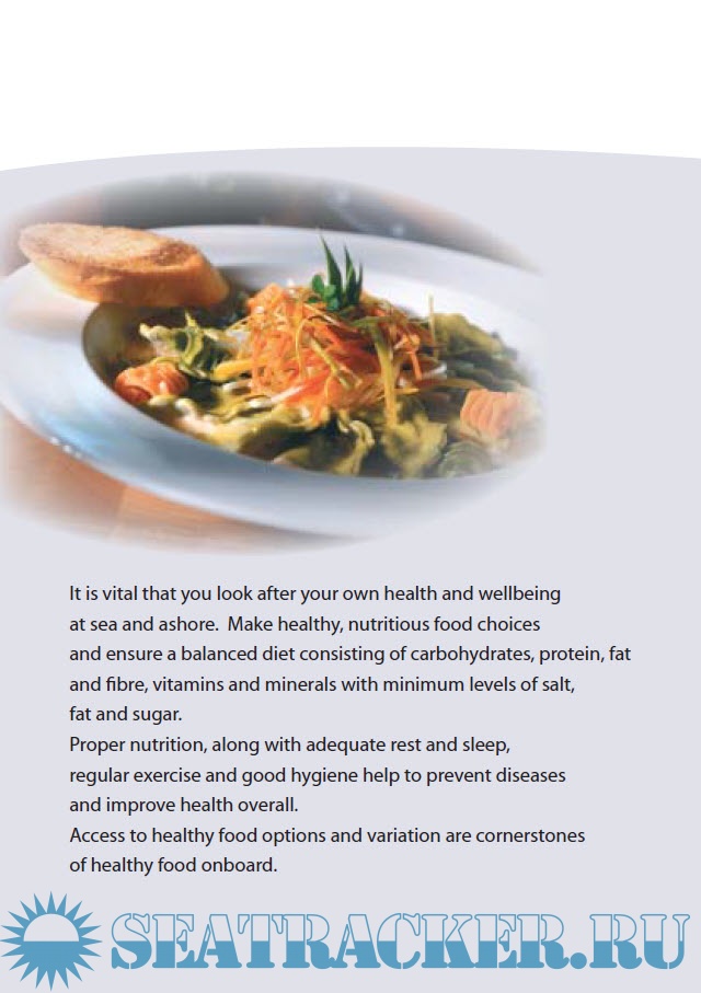 It is vital that seafarers look after their own health and wellbeing at sea and ashore. Where possible, seafarers should try to make healthy, nutritious food choices and ensure a balanced diet consisting of carbohydrates, protein, fat and fibre, vitamins and minerals with minimum levels of salt, fat and sugar.