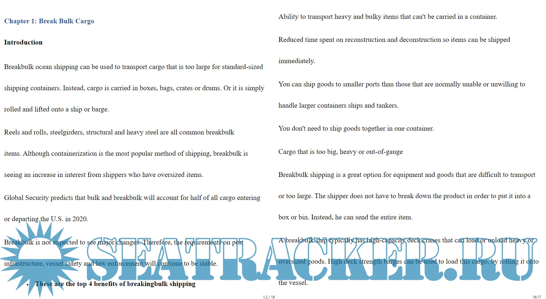Year: 2021 Language: english Author: Reeta Pal Format: EPUB Quality: eBook Pages count: 19 Description: Breakbulk ocean shipping can be used to transport cargo that is too large for standard-sized shipping containers. Instead, cargo is carried in boxes, bags, crates or drums. Or it is simply rolled and lifted onto a ship or barge. Reels and rolls, steelgirders, structural and heavy steel are all common breakbulk items. Although containerization is the most popular method of shipping, breakbulk is seeing an increase in interest from shippers who have oversized items. Global Security predicts that bulk and breakbulk will account for half of all cargo entering or departing the U.S. in 2020. Breakbulk is not expected to see major changes. Therefore, the requirements on port infrastructure, vessel safety and law enforcement will continue to be stable. These are the top 4 benefits of breakingbulk shipping Ability to transport heavy and bulky items that can't be carried in a container. Reduced time spent on reconstruction and deconstruction so items can be shipped immediately. You can ship goods to smaller ports than those that are normally unable or unwilling to handle larger containers ships and tankers. You don't need to ship goods together in one container. Cargo that is too big, heavy or out-of-gauge Breakbulk shipping is a great option for equipment and goods that are difficult to transport or too large. The shipper does not have to break down the product in order to put it into a box or bin. Instead, he can send the entire item. A breakbulk ship typically has high-capacity deck cranes that can load or unload heavy or oversized goods. High deck strength barges can be used to load this cargo, by rolling it onto the vessel.
