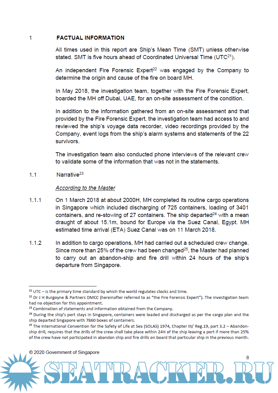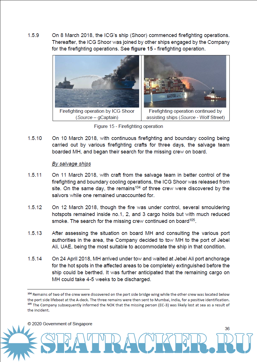 Description: On 6 March 2018 at about 1945H (Local Time), in fine weather, the Singapore registered container ship Maersk Honam (MH), which was carrying 7860 containers, while en route from Singapore to Suez Canal, encountered a severe fire that started from no.3 cargo hold when the ship was in the Arabian Sea, about 900 nautical miles west of the coast of India.
