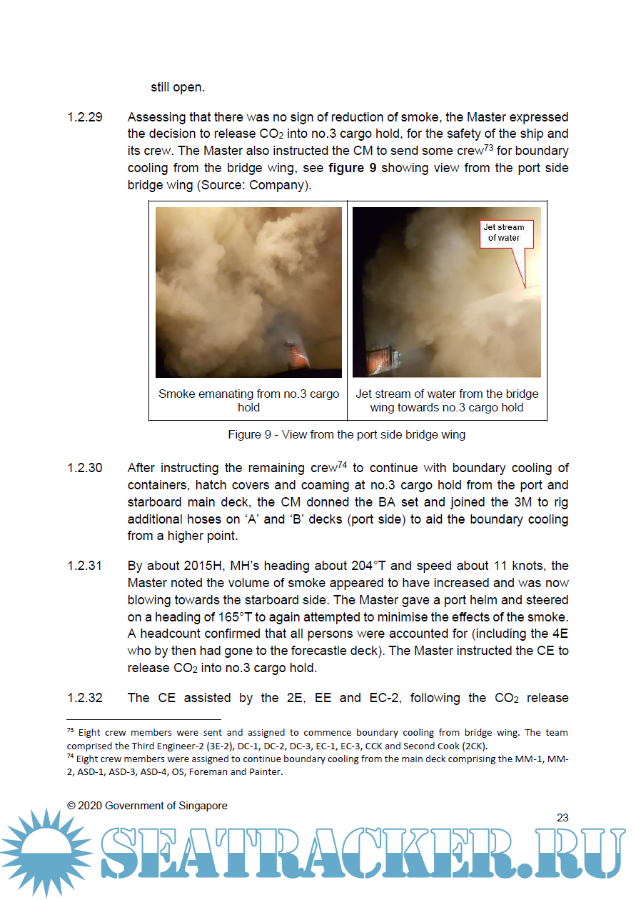 All the 27 crew responded to fight the fire by commencing boundary cooling and subsequent release of carbon dioxide (CO2) into the cargo hold but were not successful in extinguishing the fire. The crew sent out a distress signal and eventually abandoned ship at about 2215H.