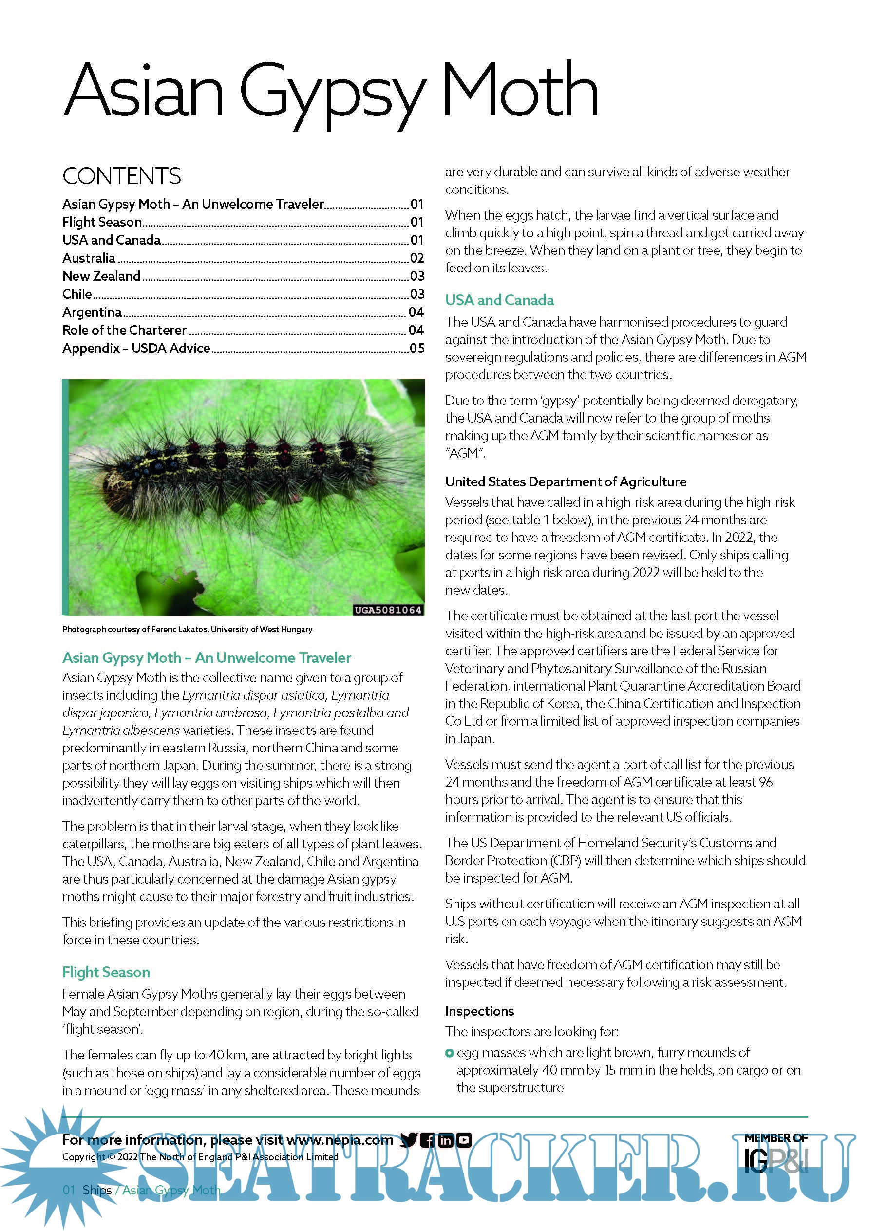 Year: 2022 Language: english Author: the North Genre: Practical guide Format: PDF Quality: eBook Pages count: 7 Description: Asian Gypsy Moth – An Unwelcome Traveler Asian Gypsy Moth is the collective name given to a group of insects including the Lymantria dispar asiatica, Lymantria dispar japonica, Lymantria umbrosa, Lymantria postalba and Lymantria albescens varieties. These insects are found predominantly in eastern Russia, northern China and some parts of northern Japan. During the summer, there is a strong possibility they will lay eggs on visiting ships which will then inadvertently carry them to other parts of the world. The problem is that in their larval stage, when they look like caterpillars, the moths are big eaters of all types of plant leaves. The USA, Canada, Australia, New Zealand, Chile and Argentina are thus particularly concerned at the damage Asian gypsy moths might cause to their major forestry and fruit industries. This briefing provides an update of the various restrictions in force in these countries.