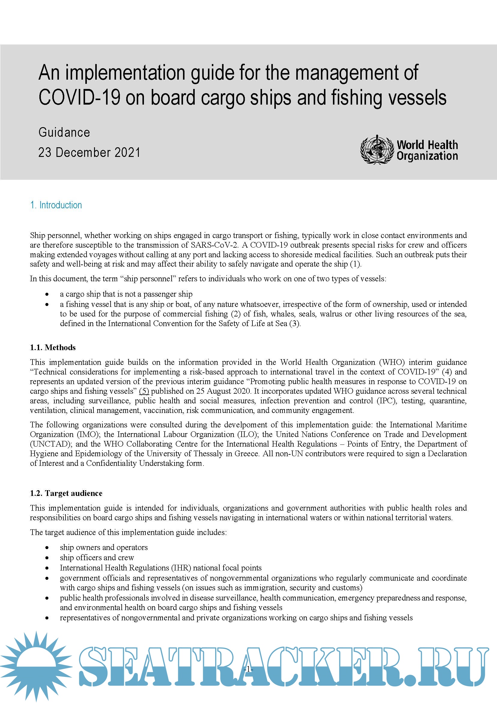 Year: 2021 Language: english Author: WHO Genre: Guide Format: PDF Quality: eBook Pages count: 14 Description: Ship personnel, whether working on ships engaged in cargo transport or fishing, typically work in close contact environments and are therefore susceptible to the transmission of SARS-CoV-2. A COVID-19 outbreak presents special risks for crew and officers making extended voyages without calling at any port and lacking access to shoreside medical facilities. Such an outbreak puts their safety and well-being at risk and may affect their ability to safely navigate and operate the ship (1). In this document, the term “ship personnel” refers to individuals who work on one of two types of vessels: • a cargo ship that is not a passenger ship • a fishing vessel that is any ship or boat, of any nature whatsoever, irrespective of the form of ownership, used or intendedto be used for the purpose of commercial fishing (2) of fish, whales, seals, walrus or other living resources of the sea,defined in the International Convention for the Safety of Life at Sea (3).