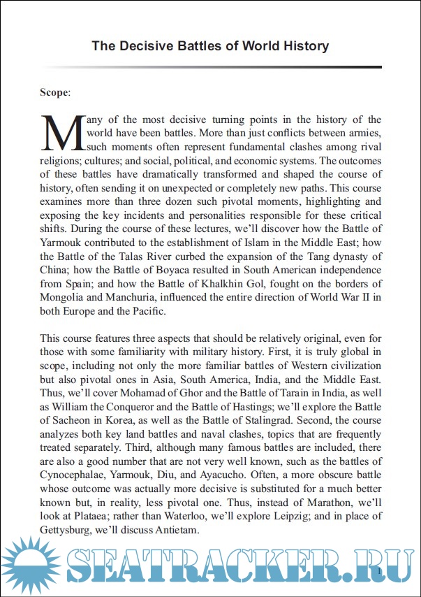 Description: Discover the military conflicts that have had the greatest impact in shifting the direction of historical events and shaping our world in The Decisive Battles of World History. Covering nearly 4,000 years, this course explores more than three dozen history-making military engagements, from the landmark battles of the Western world to their counterparts across Asia, India, and the Middle East.