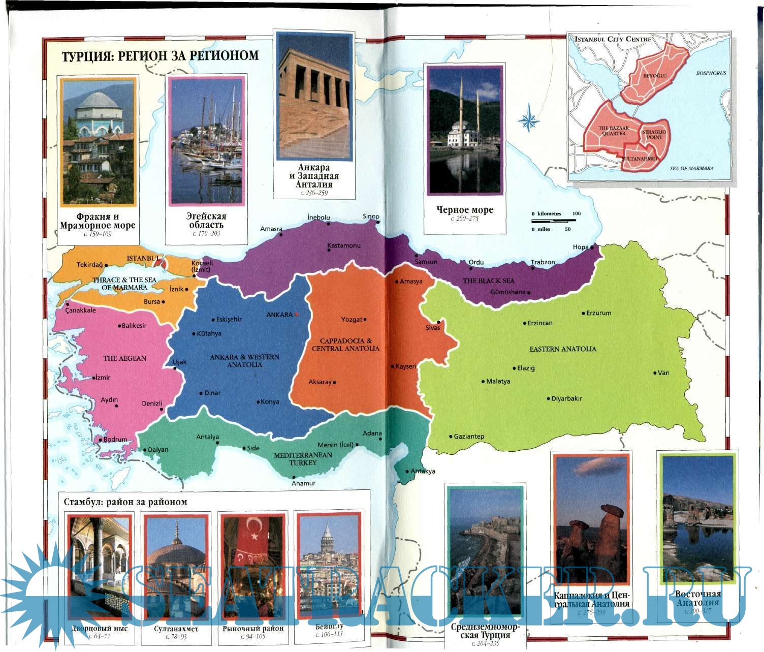 Во "Введении" рассказано о географических особенностях страны, разделы "Стамбул: район за районом" и "Турция: регион за регионом" посвящены основным достопримечательностям; данные о наиболее важных местах снабжены фотографиями, картами и иллюстрациями. Сведения о ресторанах, отелях, торговой сети и сфере развлечений вы найдете в разделе "Информация для туриста", тогда как в "Практических советах" приводятся всевозможные полезные советы - начиная от обмена денег до автобусных поездок.