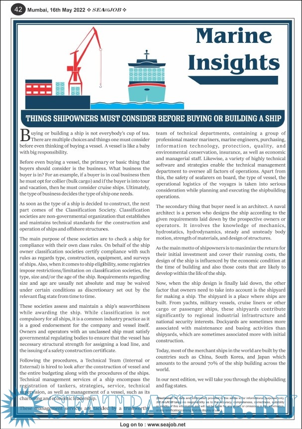 Description: The Sea and Job magazine launched in May 2007, was the second venture of Sea Line Group succeeding 'seajob.net' bringing the much renowned essence to the Group, the Sea and Job Magazine quickly gained popularity, becoming the No. 1 Shipping Magazine that came to be widely circulated all over India. Sea and Job over the years has evolved as the most trusted, ethical, objective and read maritime publication that possesses a large database of subscribers from various verticals in the industry.The magazine provides informative and interesting articles covering not just the shipping world but also the world outside it.Sea and Job is also a medium for the shipping/ manning companies to advertise marine jobs and also to promote their organization by publicizing internal activities like seminars, sports events and parties.Some notable endeavors of the magazine include the Know Your Recruiter Column, the Sailing Episodes Column and the Marine Insights section. The consistent efforts and the dedication to provide extraordinary services to the industry has resulted in the magnifying popularity and patronage of Sea and Job.