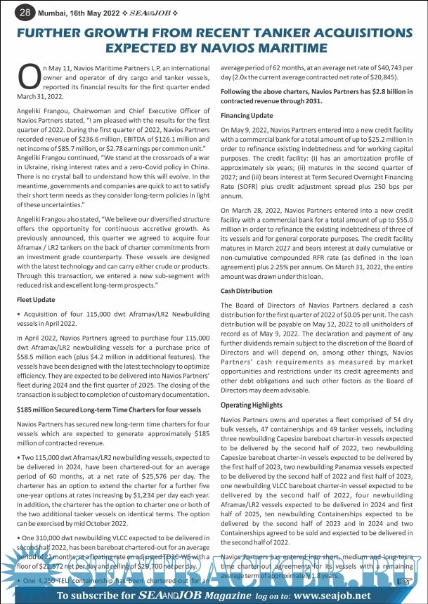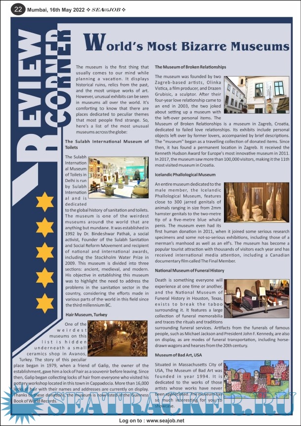 Year: 2022 Language: english Author: Sea Line Group Genre: Periodical (magazine) Publisher: Sea Line Group Edition: Vol.XV No.10/22 Format: PDF Quality: eBook Pages count: 68 Description: The Sea and Job magazine launched in May 2007, was the second venture of Sea Line Group succeeding 'seajob.net' bringing the much renowned essence to the Group, the Sea and Job Magazine quickly gained popularity, becoming the No. 1 Shipping Magazine that came to be widely circulated all over India. Sea and Job over the years has evolved as the most trusted, ethical, objective and read maritime publication that possesses a large database of subscribers from various verticals in the industry.The magazine provides informative and interesting articles covering not just the shipping world but also the world outside it.Sea and Job is also a medium for the shipping/ manning companies to advertise marine jobs and also to promote their organization by publicizing internal activities like seminars, sports events and parties.Some notable endeavors of the magazine include the Know Your Recruiter Column, the Sailing Episodes Column and the Marine Insights section. The consistent efforts and the dedication to provide extraordinary services to the industry has resulted in the magnifying popularity and patronage of Sea and Job. Additional info: 16-31 May 2022.