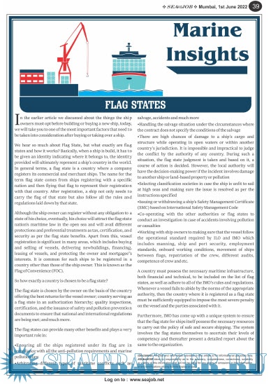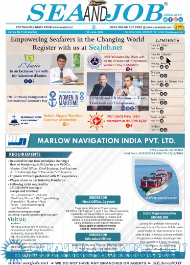 Description: The Sea and Job magazine launched in May 2007, was the second venture of Sea Line Group succeeding 'seajob.net' bringing the much renowned essence to the Group, the Sea and Job Magazine quickly gained popularity, becoming the No. 1 Shipping Magazine that came to be widely circulated all over India. Sea and Job over the years has evolved as the most trusted, ethical, objective and read maritime publication that possesses a large database of subscribers from various verticals in the industry.The magazine provides informative and interesting articles covering not just the shipping world but also the world outside it.Sea and Job is also a medium for the shipping/ manning companies to advertise marine jobs and also to promote their organization by publicizing internal activities like seminars, sports events and parties.Some notable endeavors of the magazine include the Know Your Recruiter Column, the Sailing Episodes Column and the Marine Insights section. The consistent efforts and the dedication to provide extraordinary services to the industry has resulted in the magnifying popularity and patronage of Sea and Job.