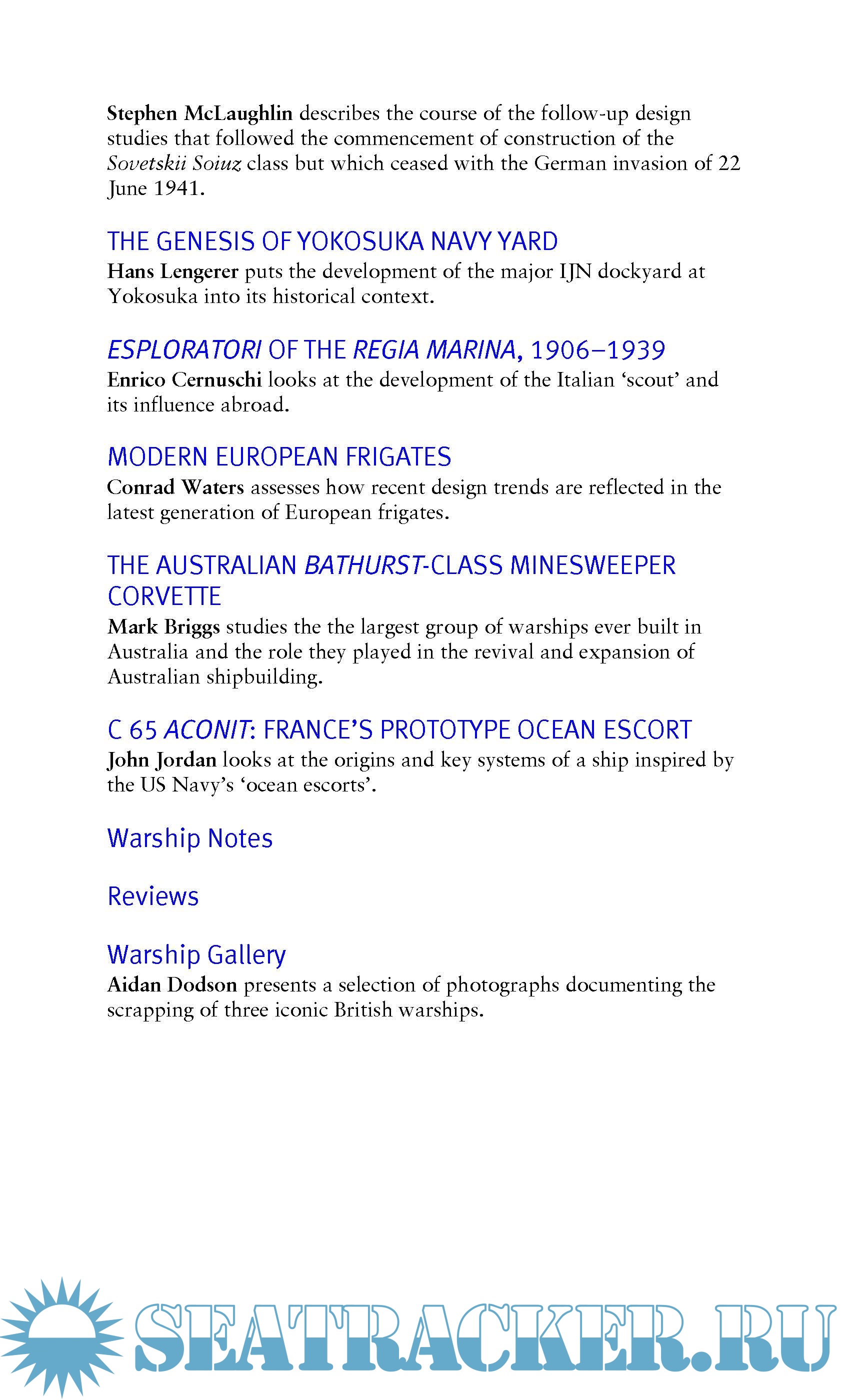 The varied topics in this year's annual includes articles on the Imperial Japanese Navy carriers Soryu and Hiryu, post-war radar development in the Royal Navy, gunboats in the Imperial German Navy, Soviet battleship designs of the early Second World War, modern European frigates, and the origins of the Yokosuka naval yard.