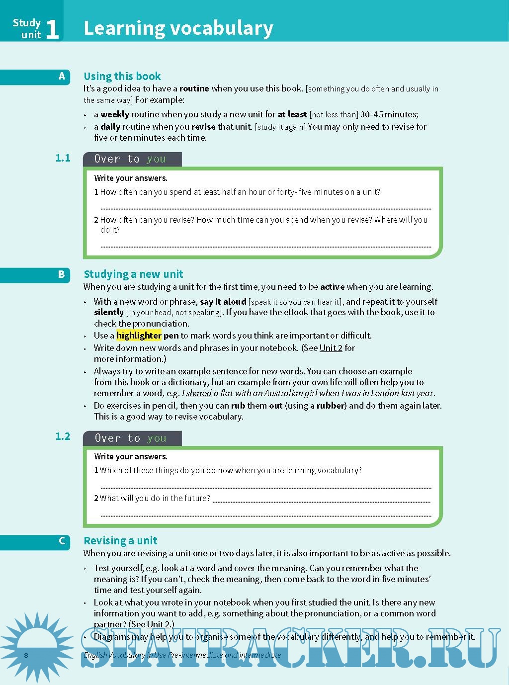 Vocabulary explanations and practice for pre-intermediate and intermediate level (B1) learners of English. Perfect for both self-study and classroom activities. Quickly expand your vocabulary with 100 units of easy to understand explanations and practice exercises. Be confident about what you are learning, thanks to Cambridge research into how English is really spoken and written, and get better at studying by yourself, with units on learning vocabulary, personalised practice and an easy to use answer key.