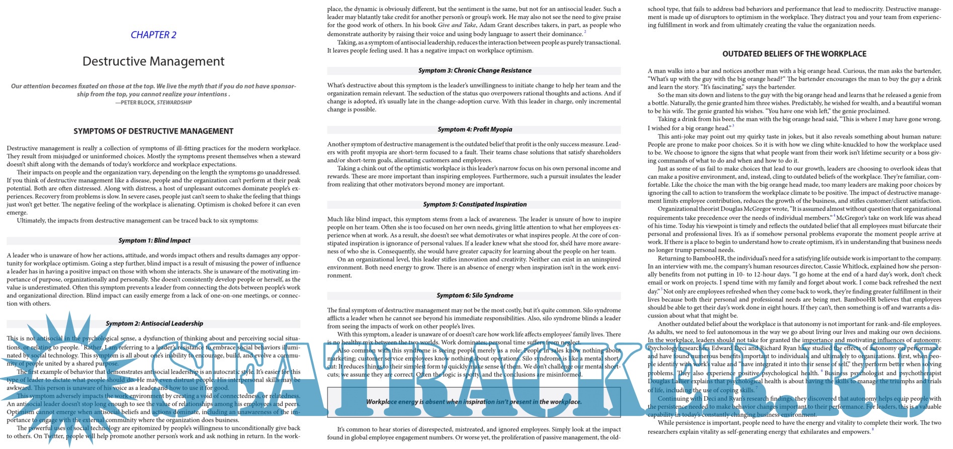Year: 2016 Language: english Author: Shawn Murphy Genre: Collection of books ISBN: 978-0-8144-3620-2 (eBook) Format: EPUB Quality: eBook Pages count: 225 Description: The way your workplace “feels” has a tremendous influence on people’s experience, morale, and performance. People thrive in a climate where they feel valued, where they know their contributions are meaningful, and where their core values are closely aligned with the values and character of their employer. Where they don’t feel valued, meaningful, and aligned . . . they just do their jobs. And today, in a world where opportunities to stand out are everywhere and the next killer idea can come from anywhere, “just doing our jobs” isn’t good enough.
