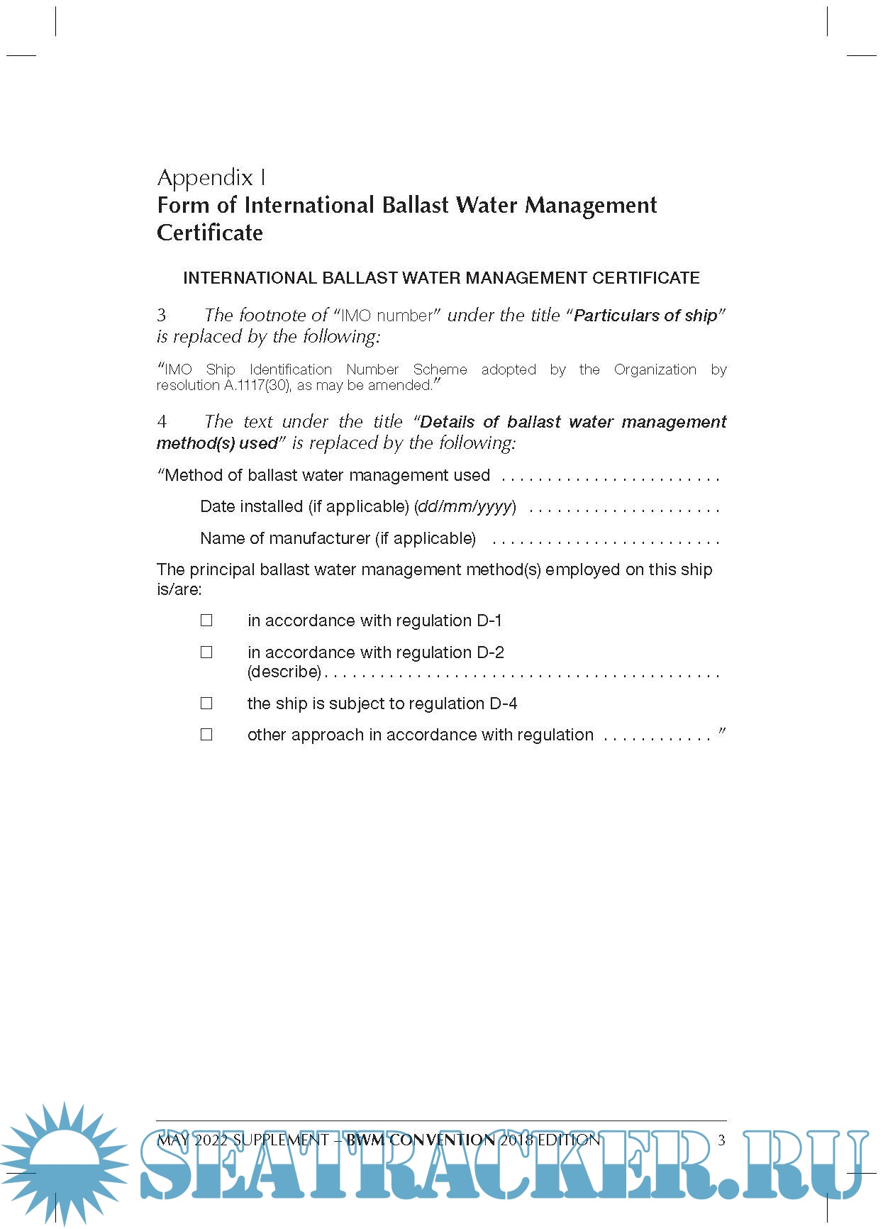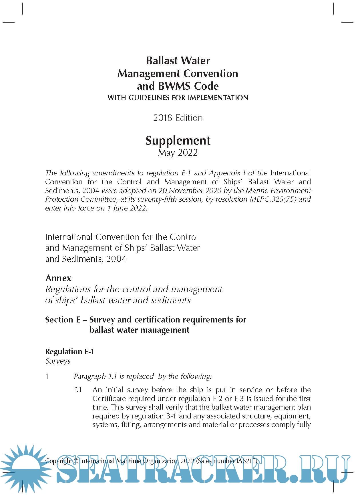 Year: 2022 Language: english Author: IMO Genre: Normative document Edition: May, 2022 Format: PDF Quality: eBook Pages count: 3 Description: Supplement ONLY for Ballast Water Management Convention and BWMS Code 2018 Edition