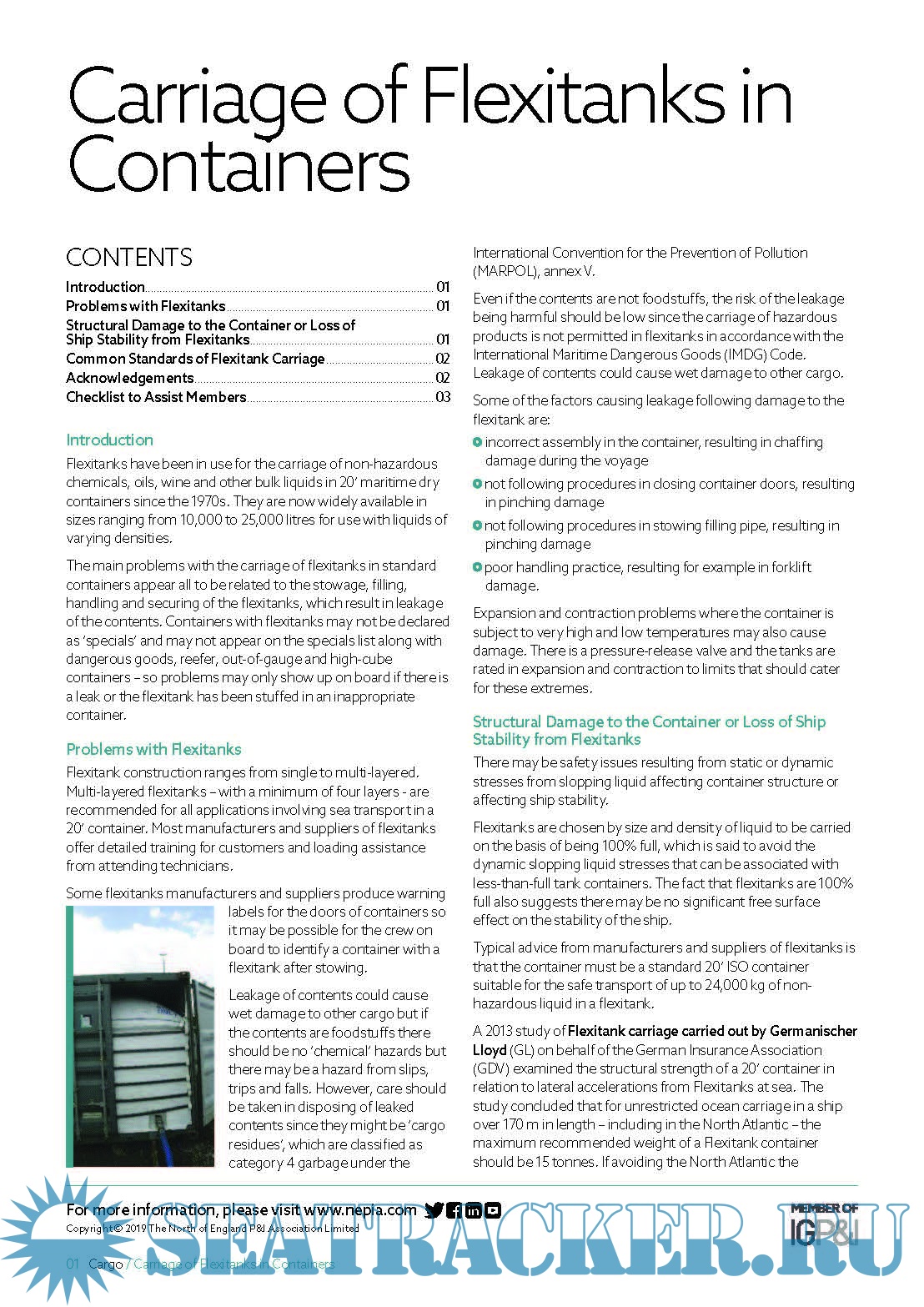 Year: 201x Language: english Author: the North Genre: Practical guide Format: PDF Quality: eBook Pages count: 4 Description: Flexitanks have been in use for the carriage of non-hazardous chemicals, oils, wine and other bulk liquids in 20’ maritime dry containers since the 1970s. They are now widely available in sizes ranging from 10,000 to 25,000 litres for use with liquids of varying densities. The purpose of this publication is to provide a source of information which is additional to that available to the maritime industry from regulatory, advisory, and consultative organisations. Whilst care is taken to ensure the accuracy of any information made available no warranty of accuracy is given and users of that information are to be responsible for satisfying themselves that the information is relevant and suitable for the purposes to which it is applied. In no circumstances whatsoever shall North be liable to any person whatsoever for any loss or damage whensoever or howsoever arising out of or in connection with the supply (including negligent supply) or use of information.