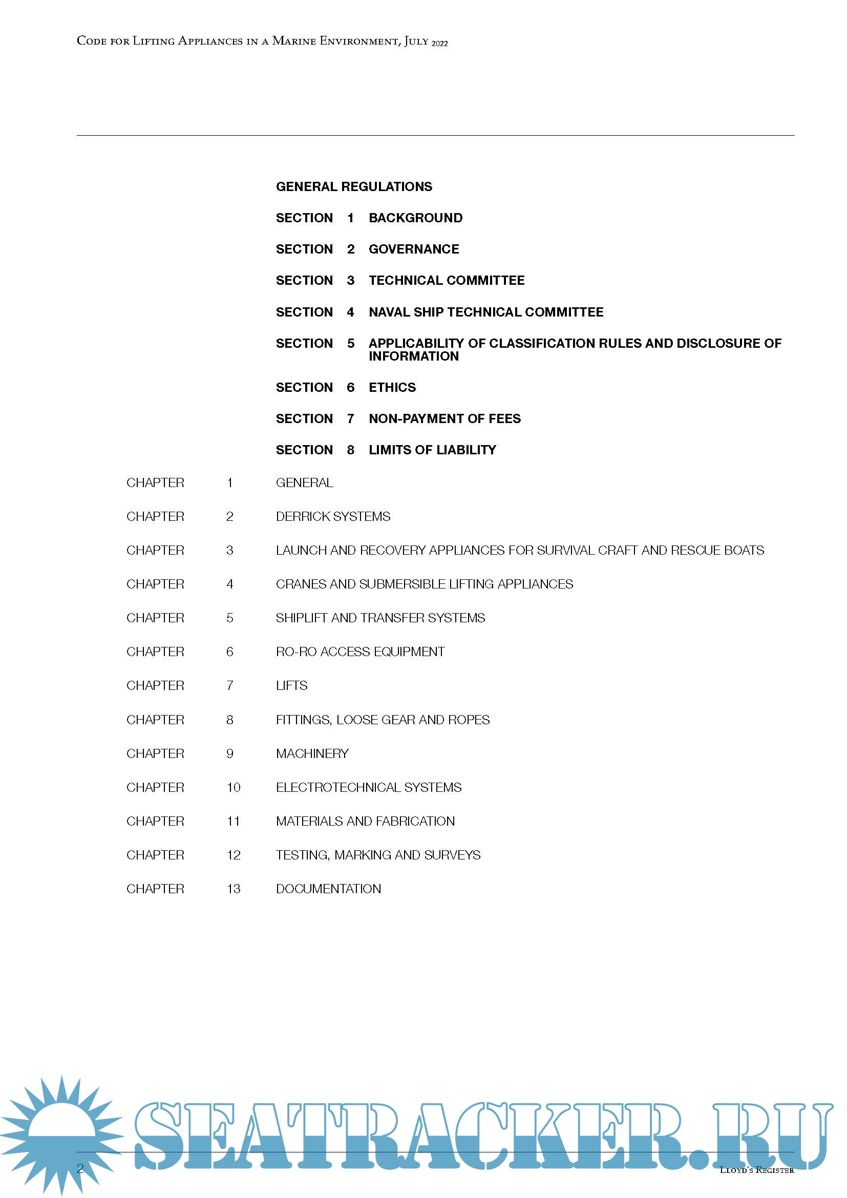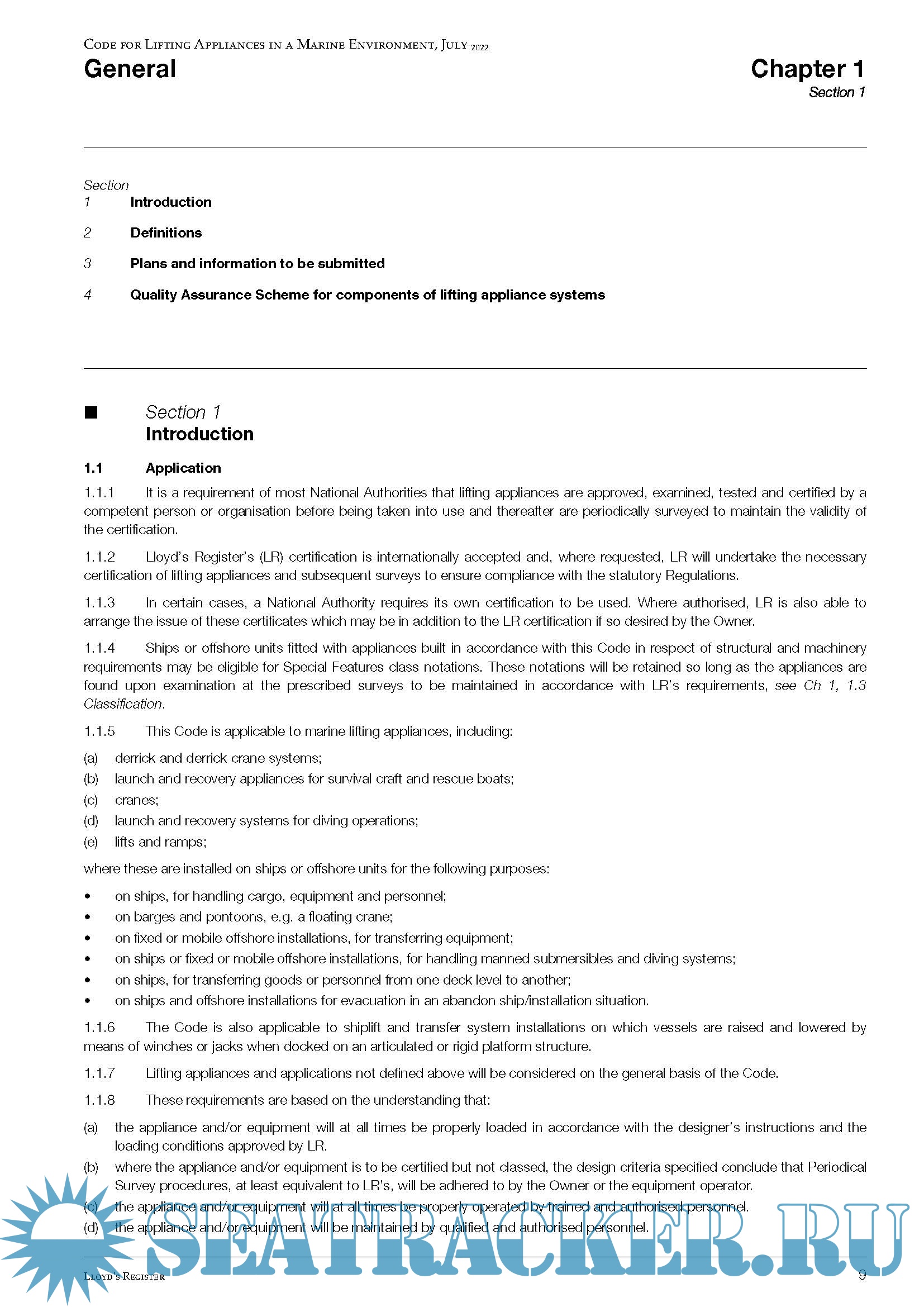 Year: 2022 Language: english Author: Lloyd's Register Genre: Normative document Edition: July 2022 Format: PDF Quality: eBook Pages count: 267 Description: It is a requirement of most National Authorities that lifting appliances are approved, examined, tested and certified by a competent person or organisation before being taken into use and thereafter are periodically surveyed to maintain the validity of the certification. Ships or offshore units fitted with appliances built in accordance with this Code in respect of structural and machinery requirements may be eligible for Special Features class notations. These notations will be retained so long as the appliances are found upon examination at the prescribed surveys to be maintained in accordance with class requirements. This Code is applicable to marine lifting appliances, including: (a) derrick and derrick crane systems; (b) launch and recovery appliances for survival craft and rescue boats; (c) cranes; (d) launch and recovery systems for diving operations; (e) lifts and ramps;