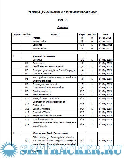 Year: 2015 Language: english Author: D.G. Shipping, India Format: PDF Quality: eBook Pages count: 207 Description: Training, Examination and Assessment Programme (TEAP) - Part A for Merchant Shipping (Standards of Training, Certification and Watchkeeping for Seafarers) Rules, 2014. The TEAP is designed to serve as a supporting document to the M.S. (STCW) Rules 2014, providing the necessary guidelines and details of the training Courses, sea-going service, examination, assessment, and eventual award of certificates of competency / proficiency to the various ranks of seafarers. In order to keep the TEAP contemporary, it has been decided to maintain this document in e-format, and make it available to all concerned through the DGS website www.dgshipping.gov.in. Amendments, corrections etc. will be immediately reflected in this e-document as and when effected. The TEAP describes the procedures for certification of the various ranks of seafarers, and provides details such as eligibility criteria, sea-going service requirements, training requirements, training courses and their syllabii, examination and assessment criteria, and other relevant information.