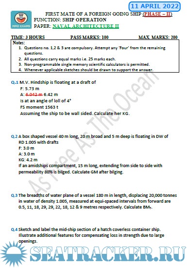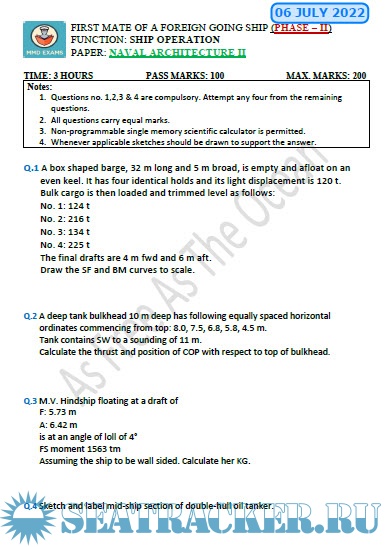 Question Paper Set for Naval Architecture II (July 2022) Phase II (Chief Mate F.G.) Mercantile Marine Department (MMD), India Examinations