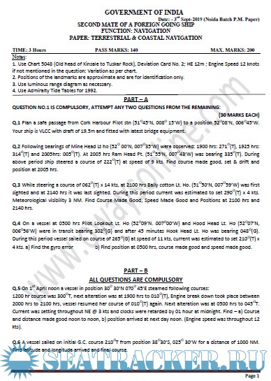 Question Paper Set for Terrestrial and Coastal Navigation (July 2022) for Second Mate (F.G.) Mercantile Marine Department (MMD), India Examinations