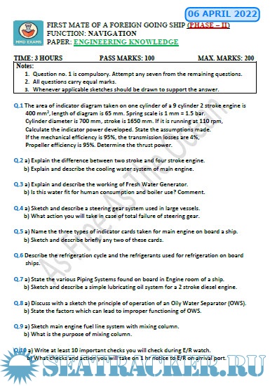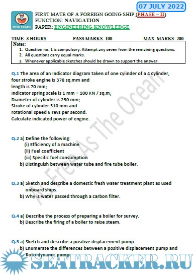 Question Paper Set for Engineering Knowledge (July 2022) Phase II (Chief Mate F.G.) Mercantile Marine Department (MMD), India Examinations