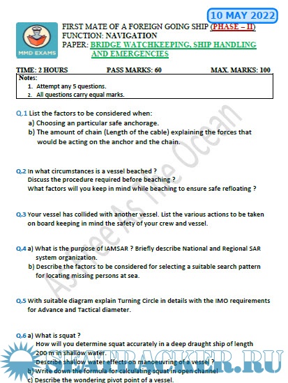 Question Paper Set for Bridge Watchkeeping, Ship Handling and Emergencies (July 2022) Phase II (Chief Mate F.G.) Mercantile Marine Department (MMD), India Examinations
