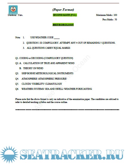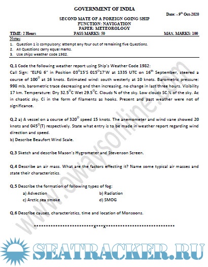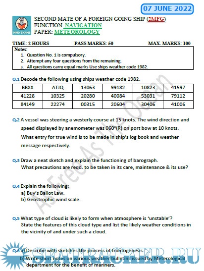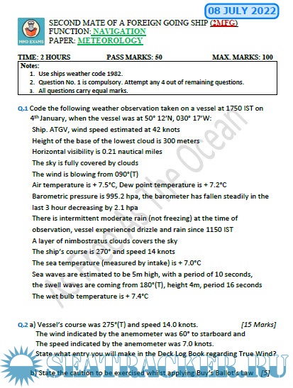 Question Paper Set for Meteorology (July 2022) for Second Mate (F.G.) Mercantile Marine Department (MMD), India Examinations
