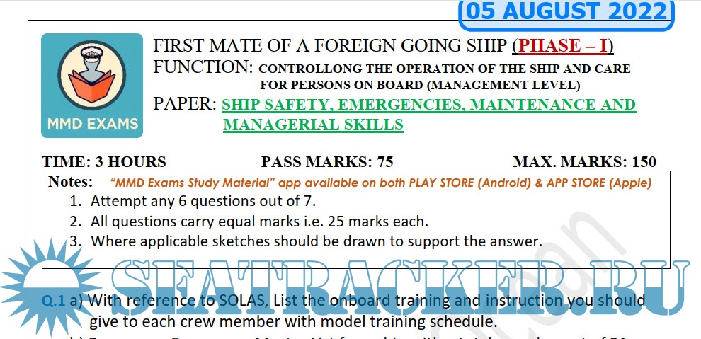 Question Paper Set for Ship Safety & Emergencies (August 2022) for Phase I (Chief Mate F.G.) Mercantile Marine Department (MMD), India Examinations