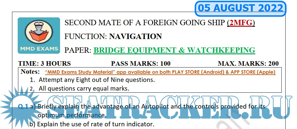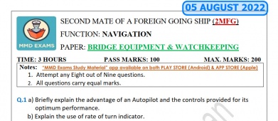 Question Paper Set for Bridge Equipment and Watchkeeping (August 2022) for Second Mate (F.G.) Mercantile Marine Department (MMD), India Examinations
