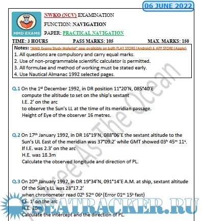 Question Paper Set for Practical Navigation (June 2022) for NWKO (NCV) Mercantile Marine Department (MMD), India Examinations