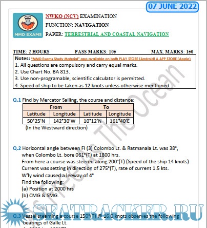 Question Paper Set for Terrestrial and Coastal Navigation (June 2022) for NWKO (NCV) Mercantile Marine Department (MMD), India Examinations