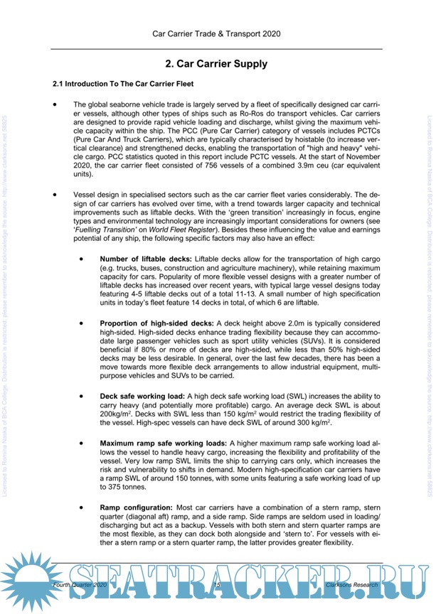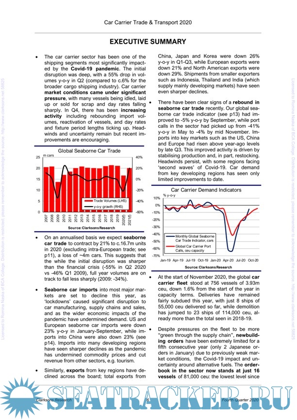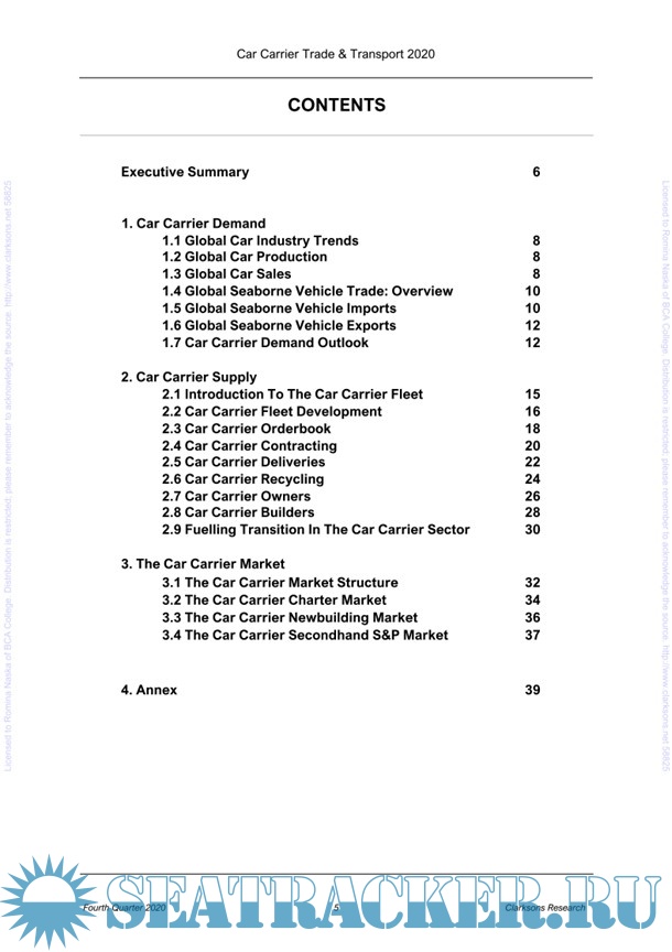 This report was prepared by Clarkson Research Services Limited to provide a briefing on the organization and economic structure of the tramp shipping industry. It uses statistical data as of start of November 2020 and the basic maritime economic theory to support the analysis and draw useful conclusions about the Car-Carrier shipping-market segment outlook.