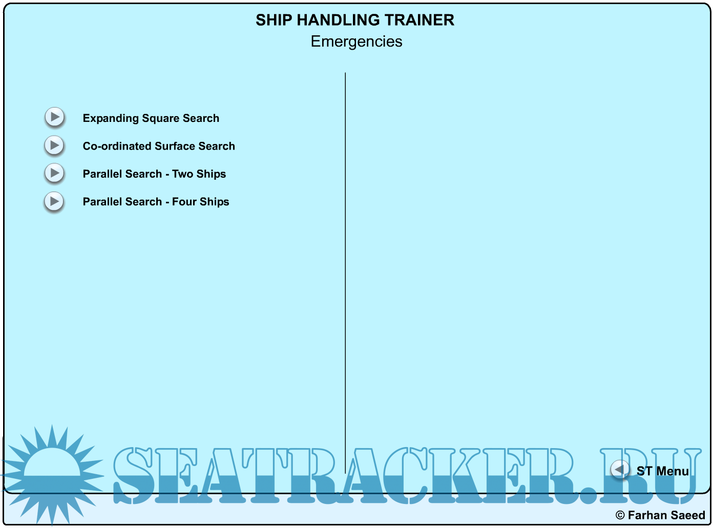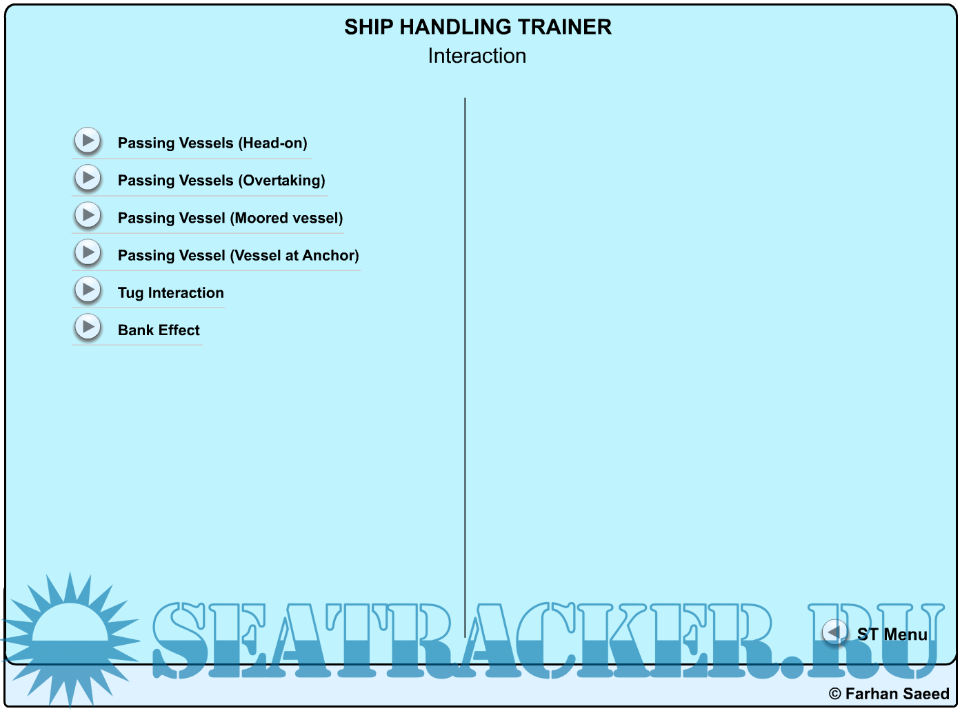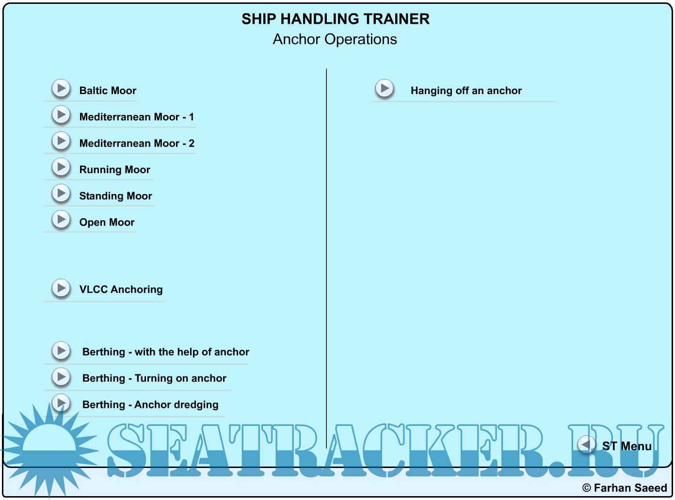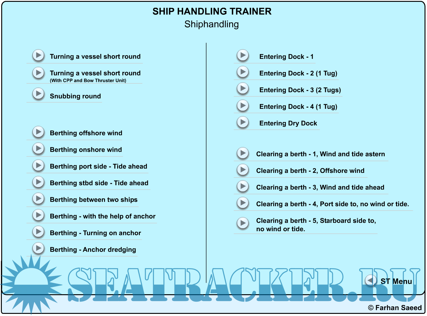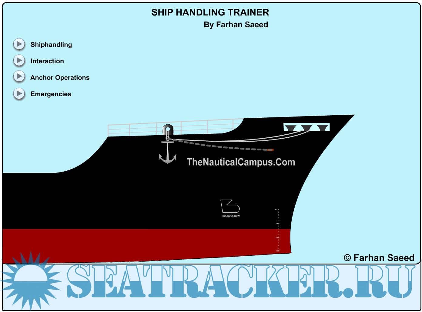 Description: Ship Handling Trainer is a is a set of animations that helps understand basic concepts of ship handling, including: Docking, Undocking, Using tugs, ships interactions, anchoring, search and rescue etc etc.