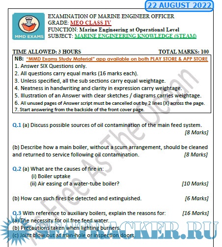 Year: 2022 Language: english Author: D.G. Shipping, India Format: PDF Quality: eBook Pages count: 2 Description: Function: Marine Engineering at Operational Level Paper: Marine Engineering Knowledge (M.E.K.) Steam M.E.O. Class IV (Part B) Question Paper for Mercantile Marine Department (MMD), India Exams. Additional info: Updated - August 2022.