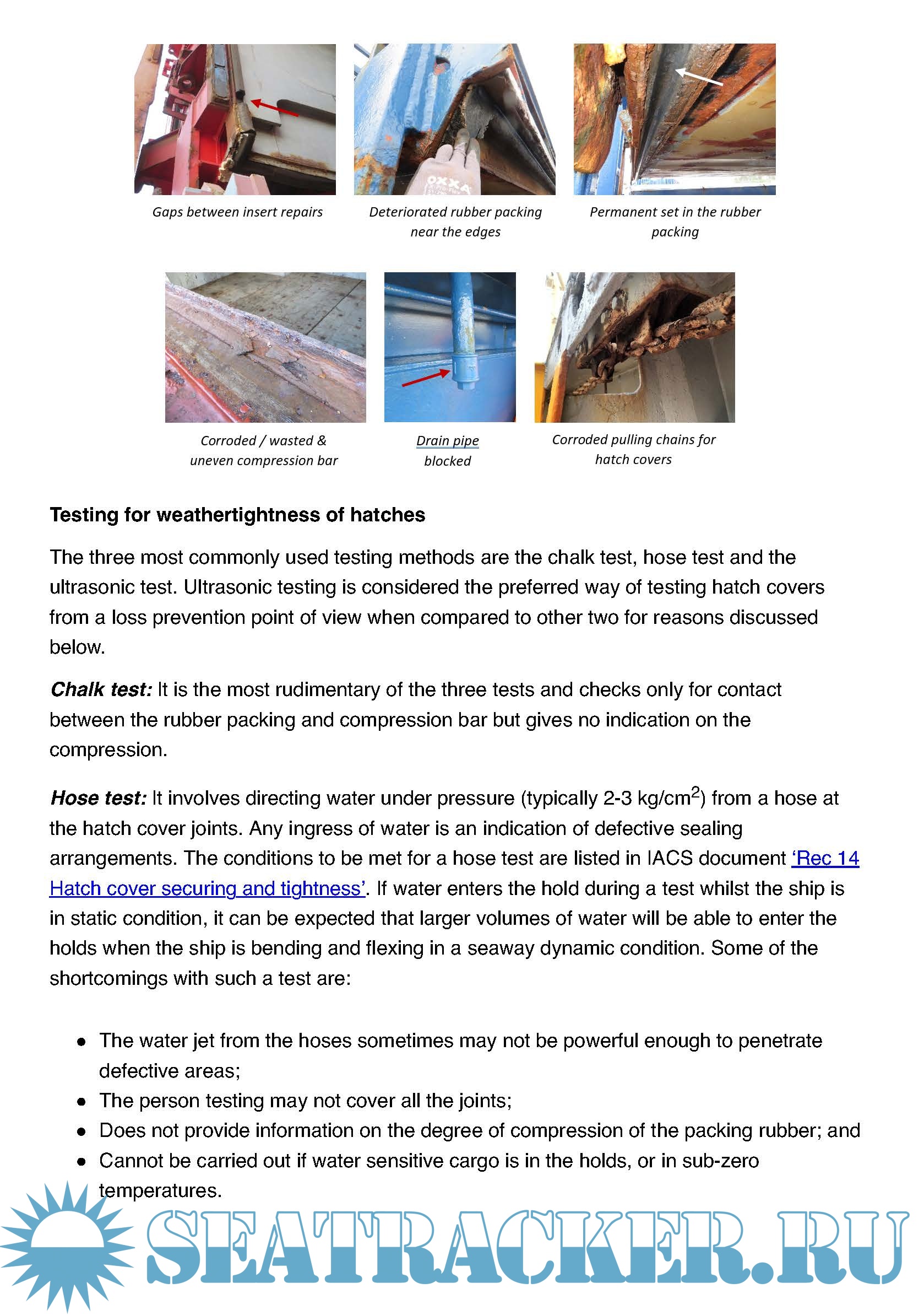 The purpose of this article is to increase awareness of the issue and provide guidance on the importance of correct maintenance and testing of the hatch covers. We will first touch upon some of the more frequently occurring problems with hatch cover systems. Then we will discuss the different methods of testing the weathertightness of hatch covers followed by the issues concerning the use of extra sealants and finally provide some recommendations.
