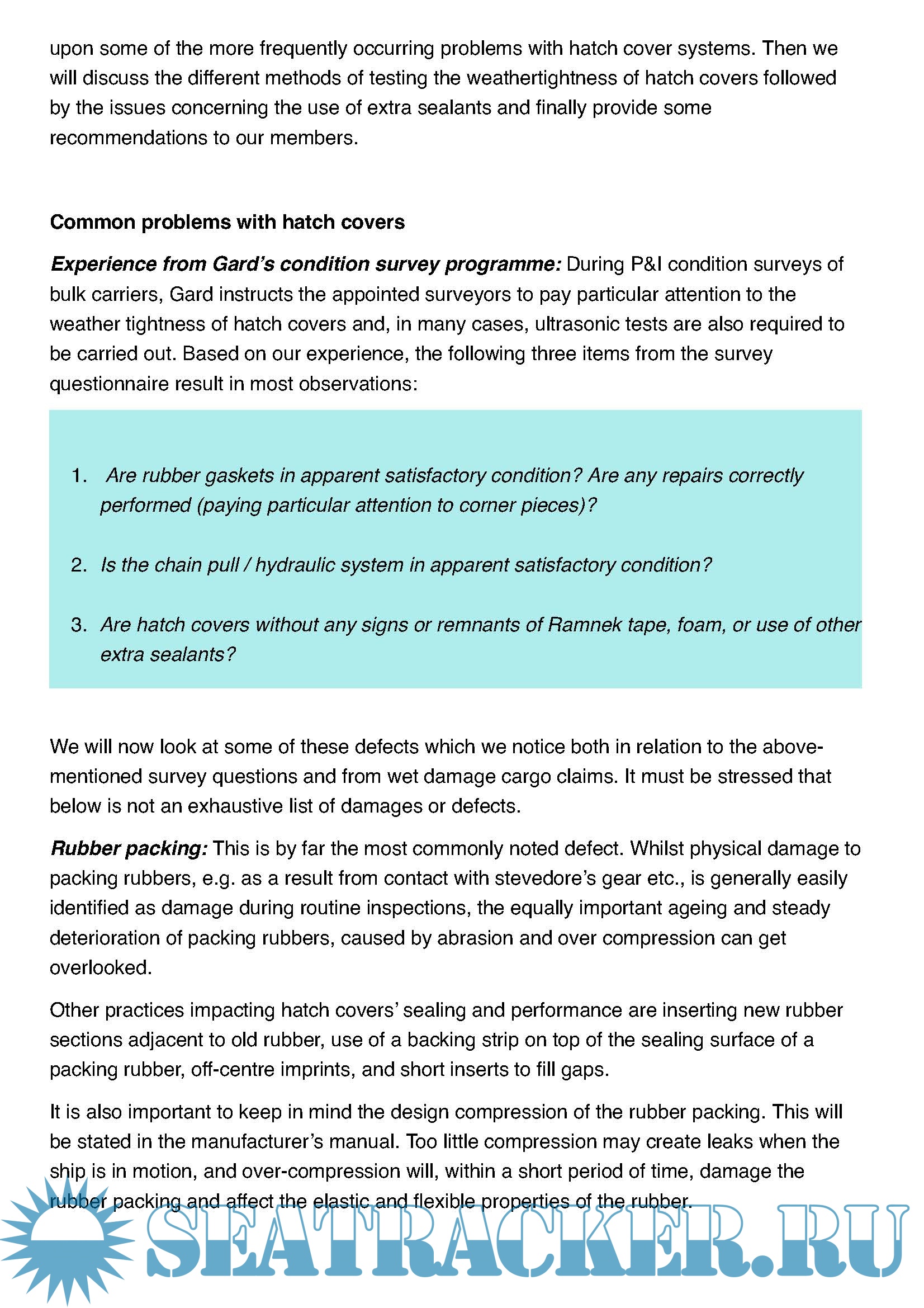 Description: Cargo damage due to wetting represents a significant percentage of the claims presented to Gard every year. One of the leading causes is defective hatch covers which in our experience remains a recurring problem. Many hatch cover related defects are also found during condition surveys carried out within the scope of our inspection program.