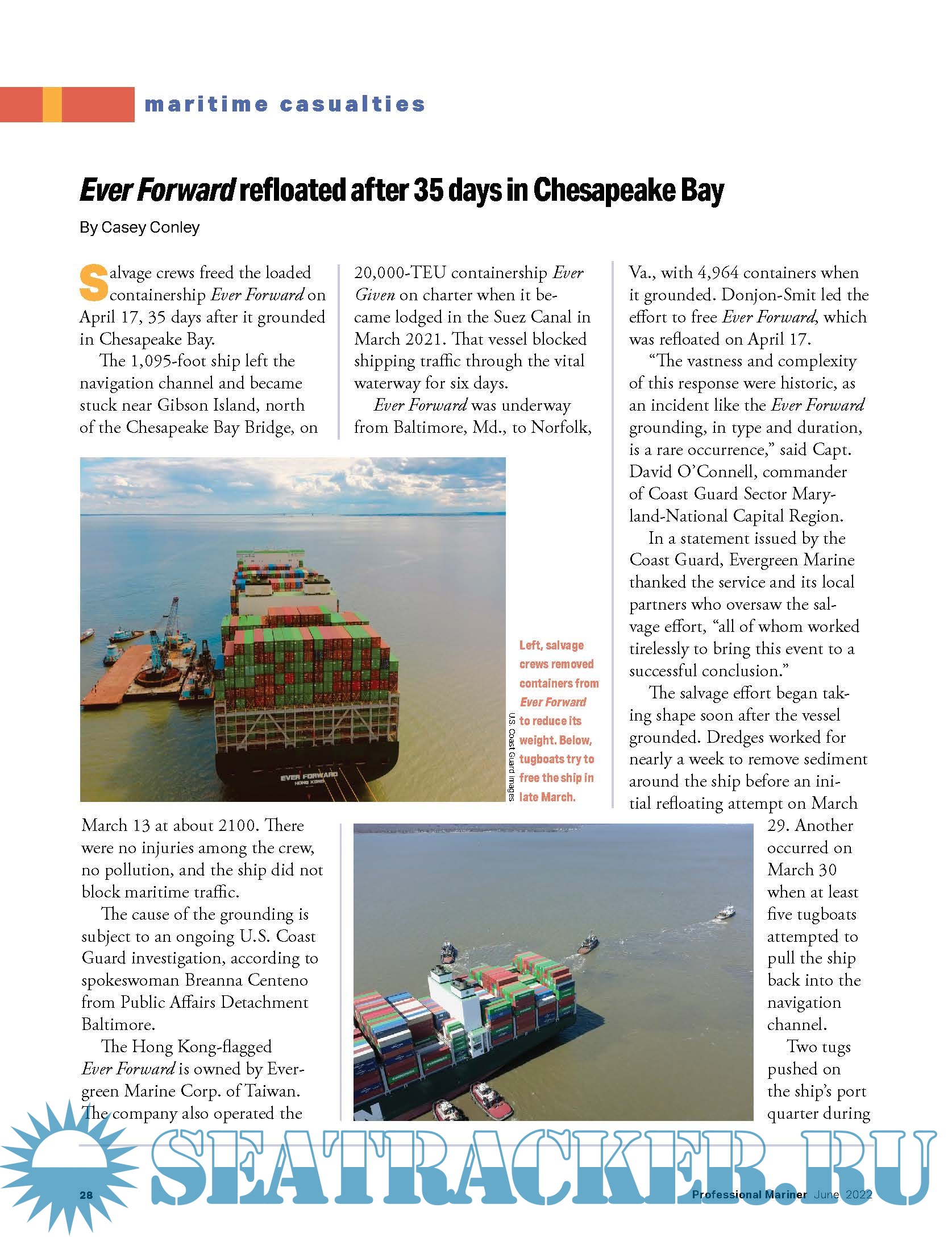 Professional Mariner magazine has been a valuable resource for the owners and operators of commercial maritime vessels of all types in the U.S. and Canada since 1993.The magazine is written for professionals who work in the maritime industry, both onboard vessels and onshore. The editorial emphasis is on training and licensing, maritime casualties, technology, engineering and regulatory trends and issues. Professional Mariner publishes twelve print issues a year, 9 regular issues plus 3 special annual issues. These annuals are American Tugboat Review, American Ship Review, and the American Training Directory. Professional Mariner also offers e-mail newsletters, a website and a digital replica of the print magazine (the digital edition has world-wide reach), February - September 2022