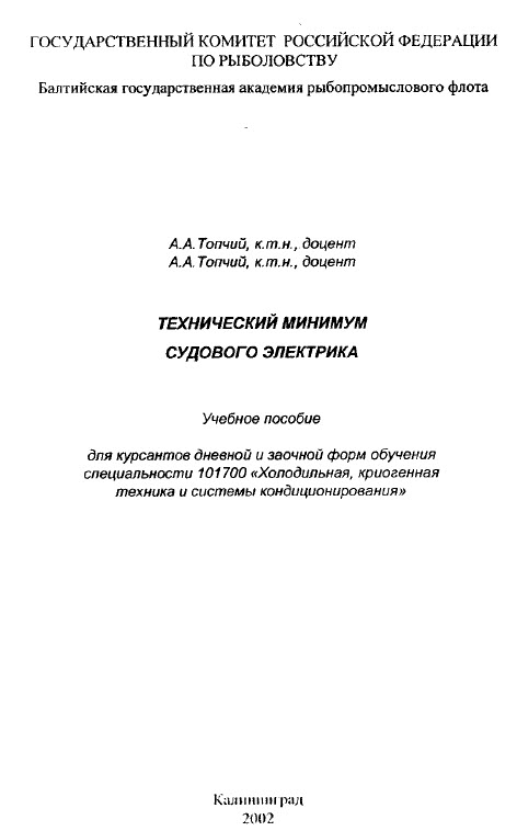 Учебное пособие разработано в соответствии с учебной программой дисциплины «Технический минимум судового электрика» и предназначено для курсантов дневной и заочной форм обучения специальности 101700 «Холодильная криогенная техника и системы кондиционирования».