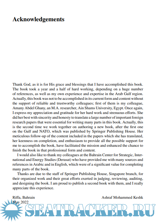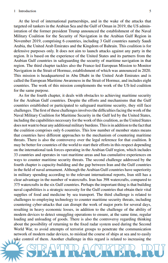 Description: This book, authored by Dr. Ashraf Muhammad Keshk, tackles the issue of “Mar-itime Security of the Arab Gulf States: An Analysis of Real Threats, Confrontation Strategies and Future Challenges”. Its significance emanates from the conspicuous increase in the maritime security threats, which have been targeting oil tankers in the Arabian Sea and the Gulf of Oman through the years (2019–2021). Actually, the chronic hazards of these threats pushed the author to raise a question: Is the Arabian Gulf region witnessing a new tanker war, similar to the Iraq-Iran war in 1980s, when the United States led an international coalition to protect the Gulf oil tankers? The chapters of this book constitute an attempt to answer this question through exposing several definitions of the maritime security concept along with illustrating the former theoretical contributions in this regard. Then, an analysis of the international legal regulations of strategic waterways in the Arabian Gulf region, namely “the Straits of Hormuz and Bab al-Mandab”, is followed.