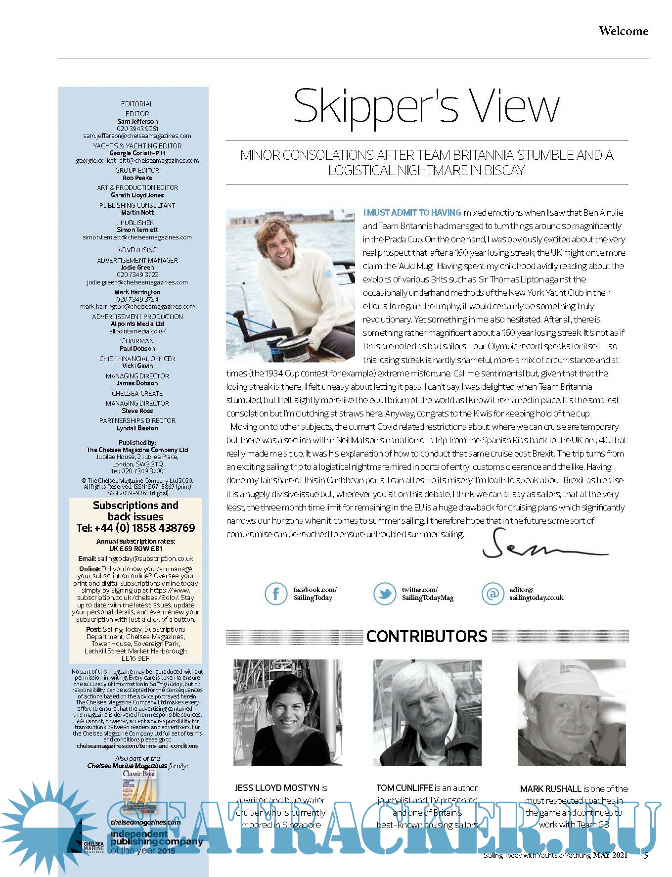 Year: 2021 Language: english Author: (Editor) Sam Jefferson Genre: Periodical (magazine) Publisher: The Chelsea Magazine Company ltd. Edition: May 2021 Format: PDF Quality: Photo of pages Pages count: 100 Description: Sailing Today is the magazine for hands-on cruising sailors whose love of sailing takes them around the British Isles, across the Channel and further, to the blue waters of the wider world.Offering a wealth of practical advice and a dynamic mix of in-depth boat, gear and equipment news, Sailing Today is written cover to cover by sailors, for sailors. Since its launch in 1997, the magazine has sealed its reputation for essential sailing information and advice.Since we launched in 1997 we have sealed our reputation as THE magazine for essential sailing information and expert advice.ST is written by sailors for sailors, from our new and used boat tests, to our step by step practical articles and in-depth gear tests, or our inspiring cruising tales from home and abroad.Whatever you want to know – from which GPS to buy, or the best way to install central heating – Sailing Today provides the best answers.With our fantastic on-board gear tests, the latest boat tests and regular advice about seamanship and navigation, we deliver practical back-up for those who enjoy using their boats and want to get the best from them.Contents