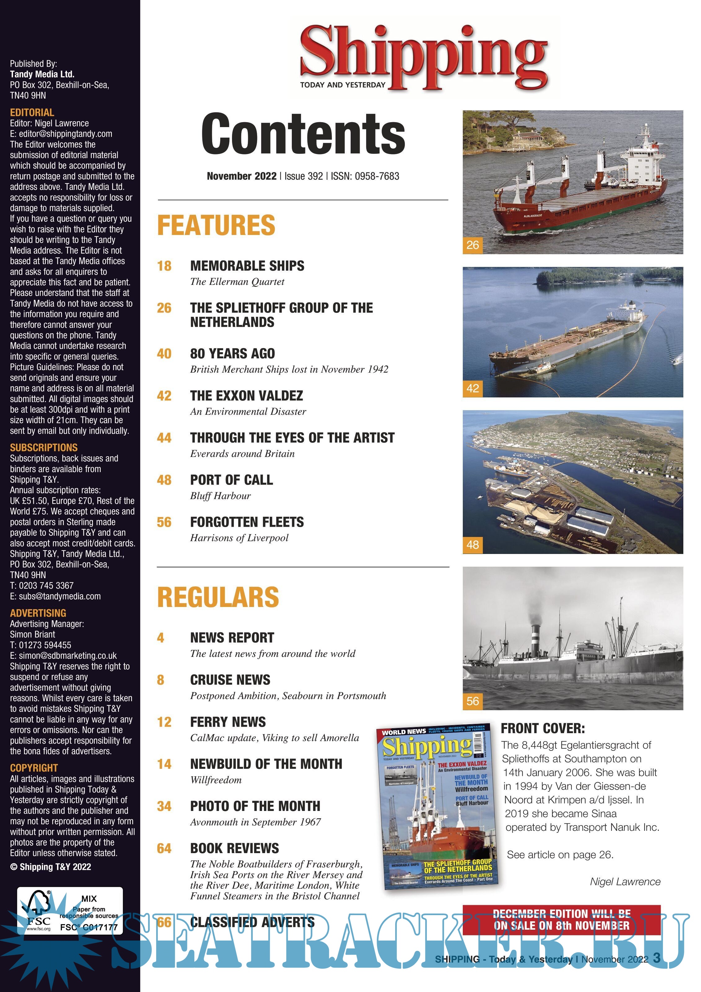 Year: 2022 Language: english Author: Nigel Lawrence (Editor) Genre: Periodical (magazine) Publisher: TANDY Media Format: PDF Quality: eBook Pages count: 68 Description: Shipping Today & Yesterday is a specialist magazine for the shipping enthusiast offering up-to-date information, topical and in-depth historical articles. Shipping Today & Yesterday was first produced in March 1990 by, the then Editor and Publisher, John Young. The first edition stated that it would, “offer a news service covering important developments in the Shipping industry Today and will look back at ships and events of Yesterday, with regular features on merchant ships. see "Contents" for details Issue No.392 November, 2022