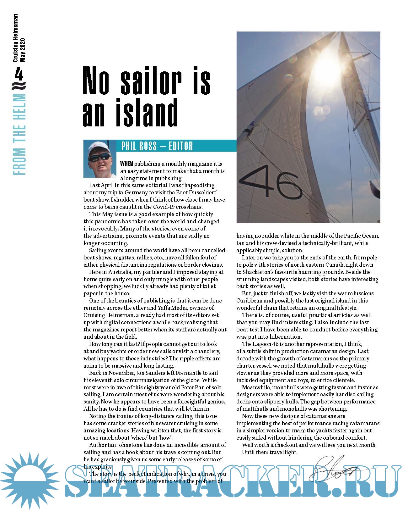 Year: 2020 Language: english Author: Phil Ross - Editor Genre: Periodical (magazine) Publisher: Tracy Yaffa Edition: May 2020 Format: PDF Quality: Photo of pages Pages count: 76 Description: Cruising Helmsman is Australia’s top-selling and circulating audited sailing magazine. It has been the leader in information for recreational yacht owners since 1981. Closed January 2021