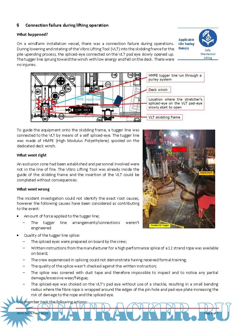 Description: The International Marine Contractors Association ( IMCA ) Safety Flashes disseminate importantinformation on incidents and potential hazards and the lessons learnt from them that can help prevent incidentsoccurring elsewhere in the industry.IMCA Safety Flashes and systems for incident reporting and analysis are an important tool for sharing vital information.By publishing them, IMCA helps its members around the world identify potential hazards, share lessons learned and avoid repetition.Safety Flashes should be succinct, specific, factually correct and written in clear language.The Secretariat will assist with this through formatting and checking of the material submitted