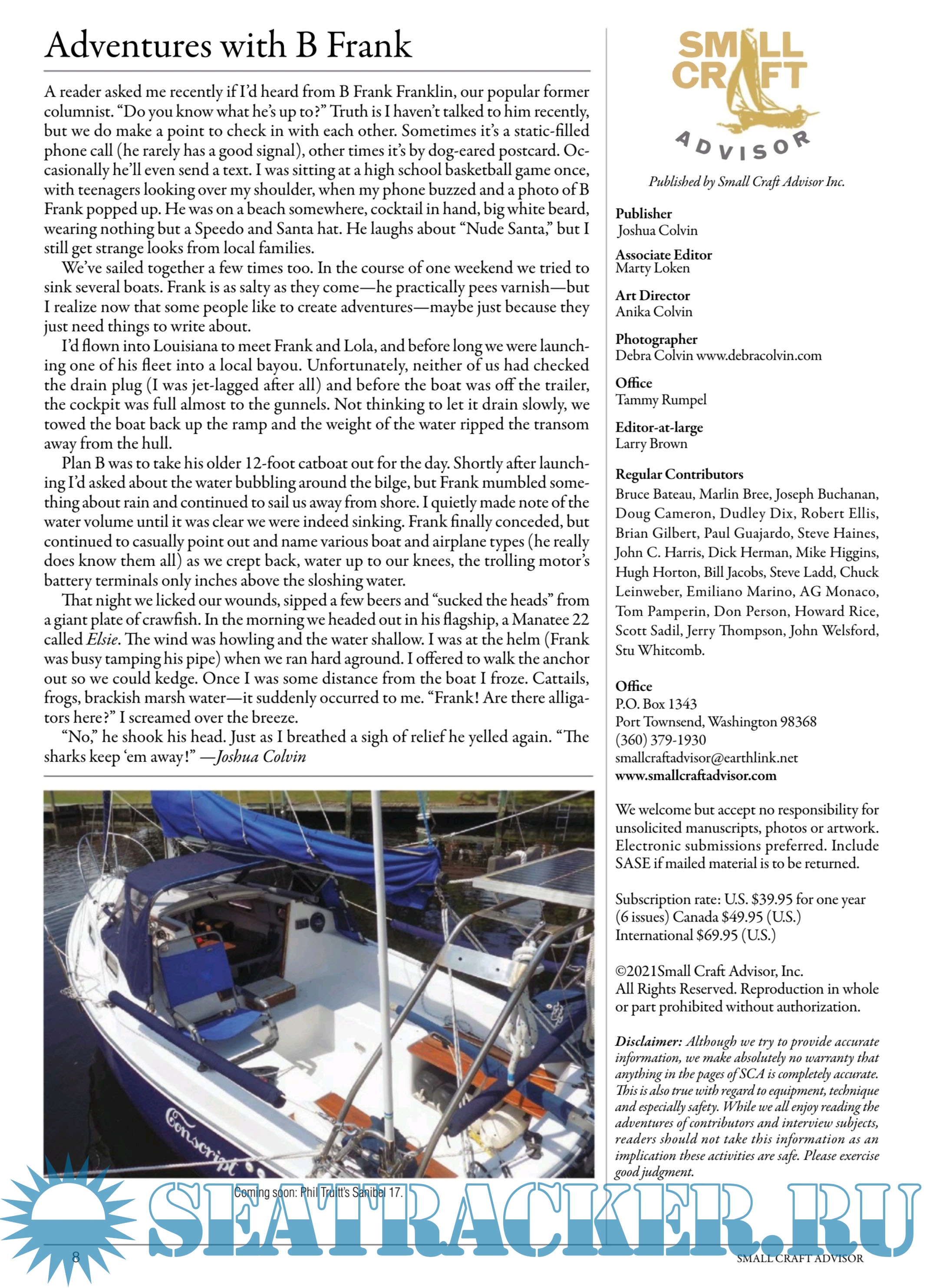 Year: 2021 Language: english Author: Small Craft Advisor Inc. Genre: Periodical (magazine) Publisher: Small Craft Advisor - November, December 2021 Edition: Small Craft AdvisoNovember, December 2021 Format: PDF Quality: Photo of pages Pages count: 84 Description: Small Craft Advisor Magazine