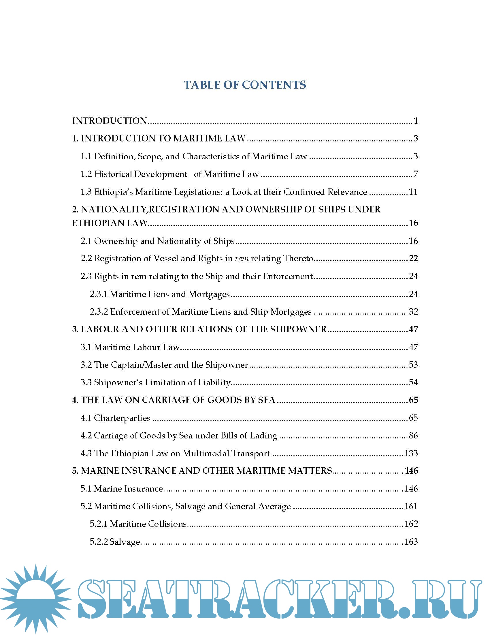 Year: 2008 Language: english Author: Hailegabriel G. Genre: Textbook Format: PDF Quality: eBook Pages count: 176 Description: Sponsored by Justice and Legal System Reseacrh Institute. Maritime law is a distinct body of law that governs private shipping activities. It covers almost the whole of modern shipping law, including ownership and registration of ships, maritime mortgage and maritime liens, maritime employment, shipowner’s limitation of liability, carriage of goods by sea (including carriage of goods by multimodal transport system), marine insurance, general average, collision and salvage. These, of course, would be studied in light of Ethiopian maritime legislations. Apart from the 1960 Maritime Code of Ethiopia, recently enacted relevant legislations will be considered. Included are the Multimodal Transport of Goods Proclamation and the Maritime Affairs Administration Proclamation. Wherever appropriate, international maritime conventions would also be considered. - appreciate the relevance of maritime legislation for land-locked shipping countries, - understand the nature and scope of maritime law - comprehend contractual as well as non-contractual principles involved in maritime law - develop skills needed to solve problems involving maritime matters, - recognize the universal aspects of laws on international shipping,