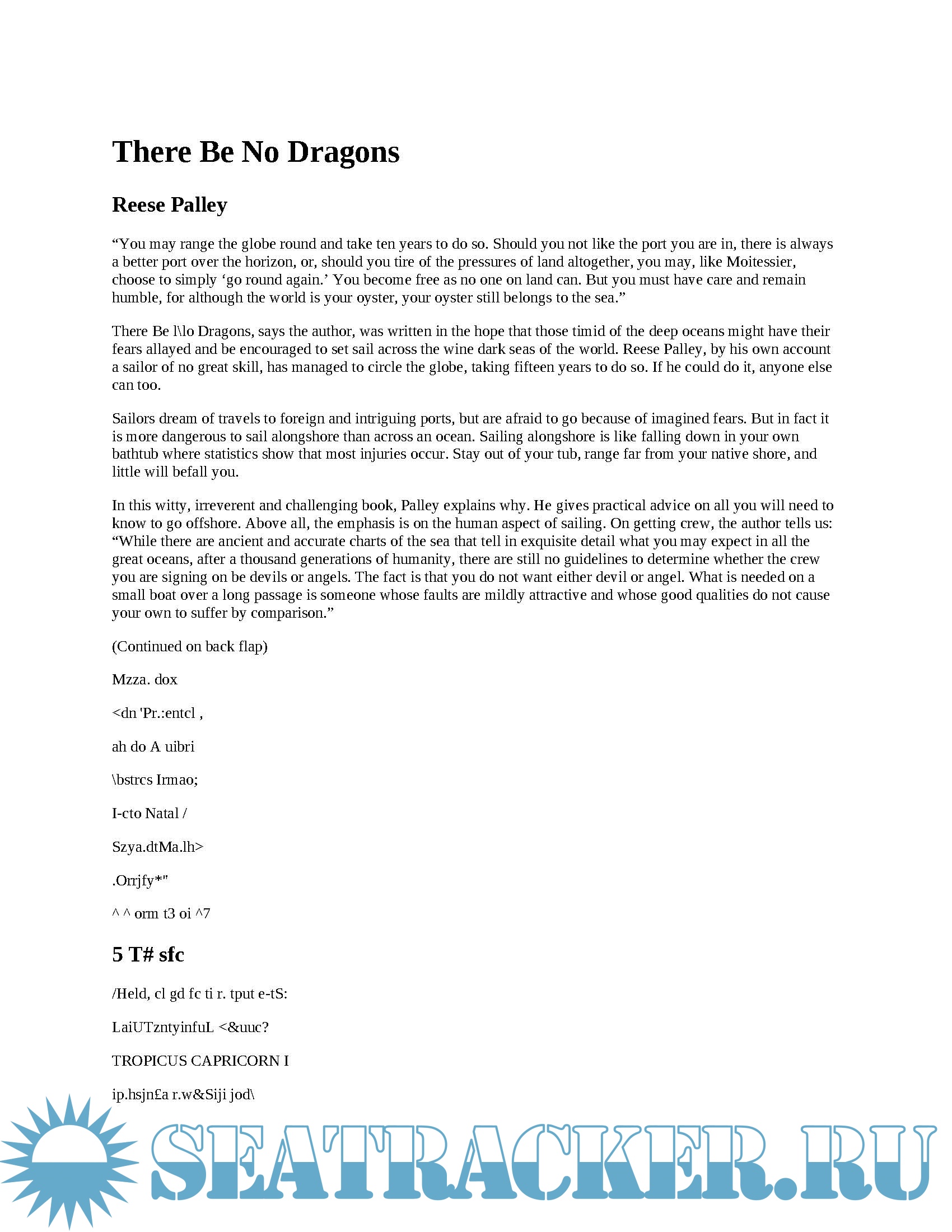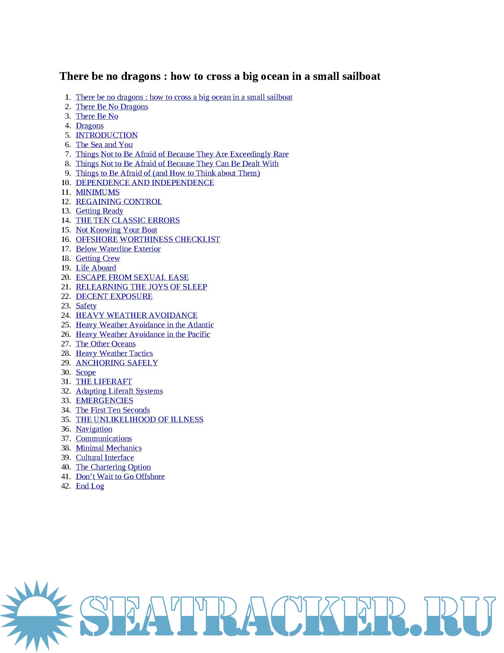 Description: The title of this book came from Portugese charts of the earliest voyages of discovery on which terra incognita bore the legend "beyond here there be dragons." The author wishes to convince timid sailors that they can go places off shore, where there are no dragons beyond the far horizons. It is designed to address the basic problems, imagined and real, that keep sailors from sea. It creates a realistic framework of skills and attitudes into which any sailor, skilled or unskilled, experienced or tyro, young or ancient, man or woman, may realize the dream of passaging a big ocean in a 30- to 40-foot boat....We dread the unknown only because it is unknown. The hardest thing is getting your mind made up to just go do it. -- The Ensign, May 1998