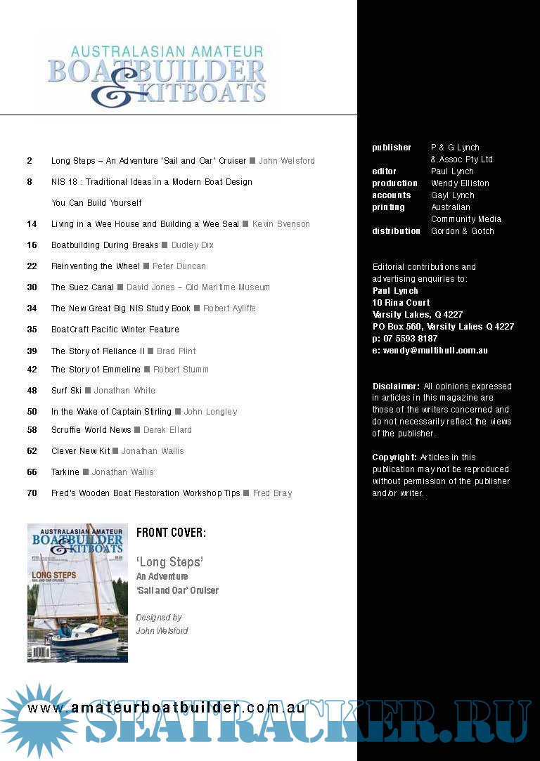 Description: Australialian Amateur Boat Builder Magazine is an Australian-based specialist publication devoted exclusively to Amateur Boat Building enthusiasts
